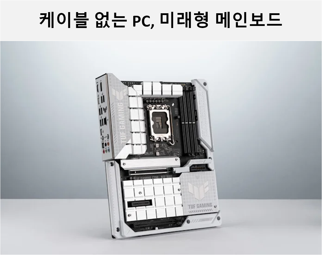 또 다른 전통의 메인보드 제조사인 ASUS에서는 BFT(Back to the Future)라는 브랜딩으로 후면 커넥터 메인보드를 출시하고 있습니다. 미래 메인보드는 이러한 모습일 것이고 ASUS에서 선도하겠다는 의지가 보이는 브랜딩입니다.