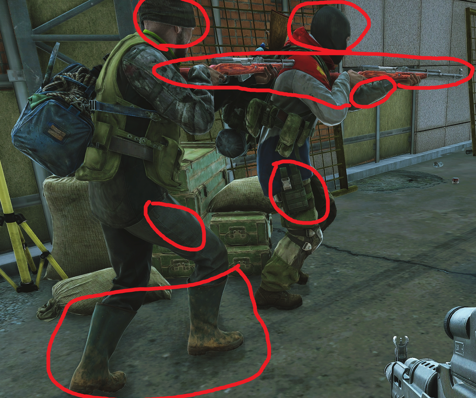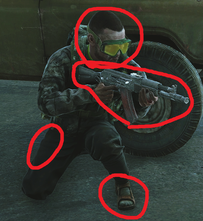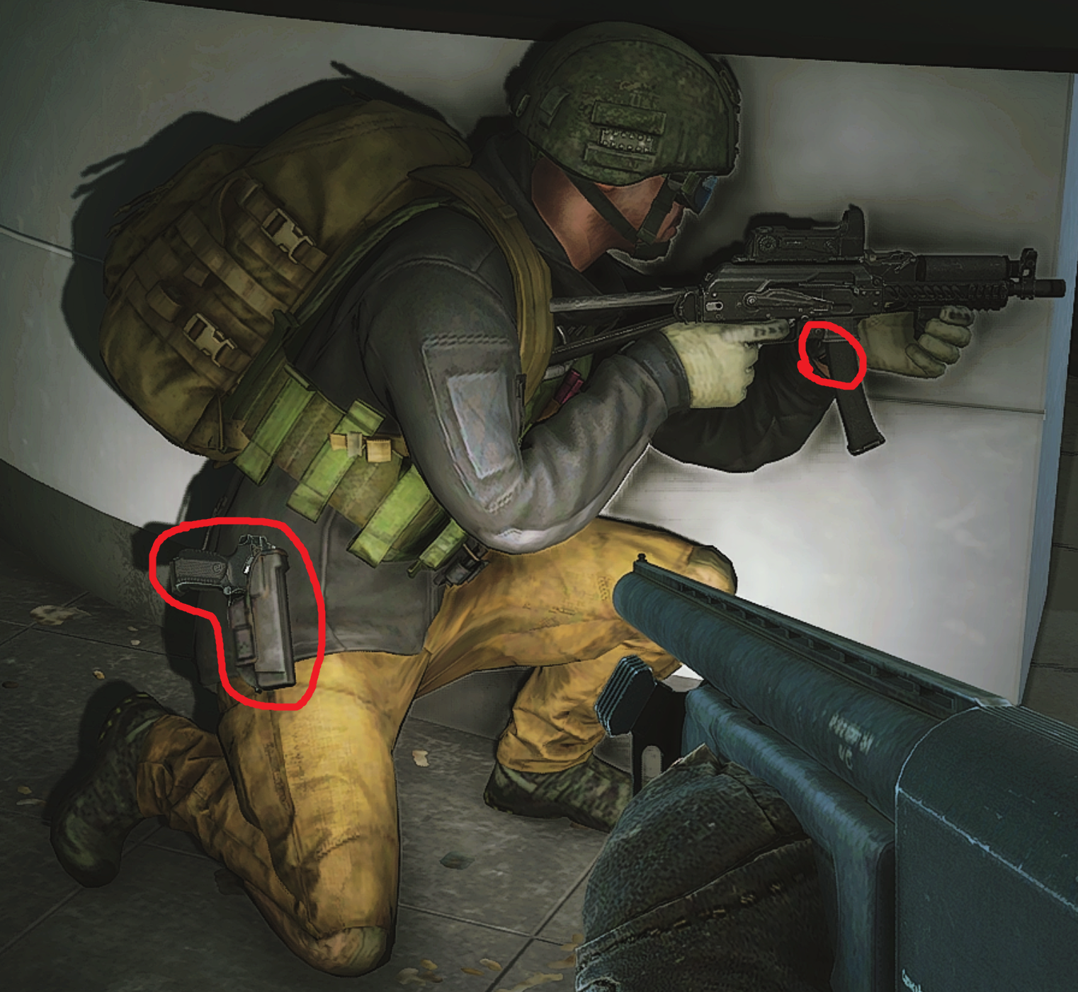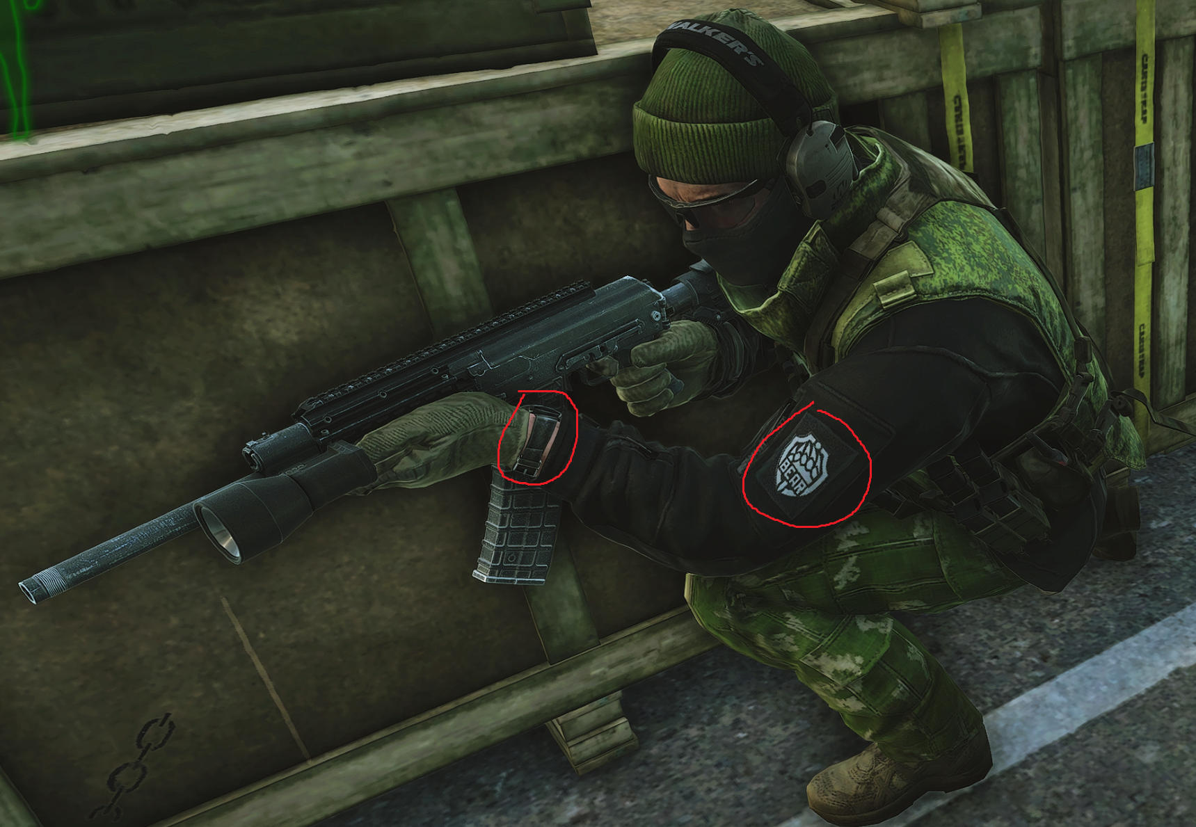 동구권 총, 더러운 장화, 권총 홀스터 없음(옆 주머니와 혼동 주의), 헤드셋과 헬멧이 없음 = 스캐브