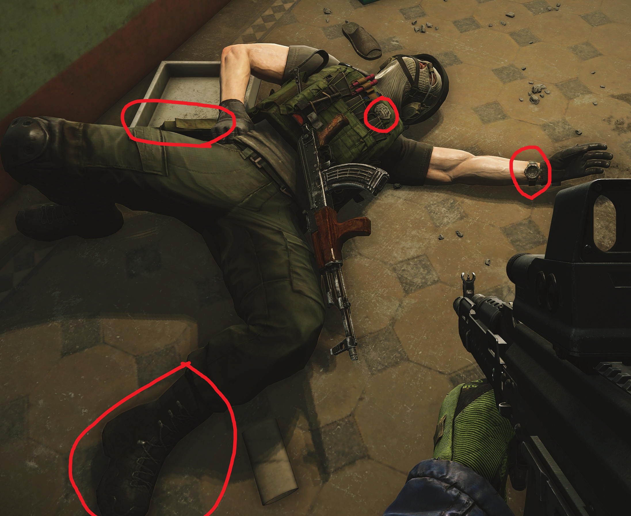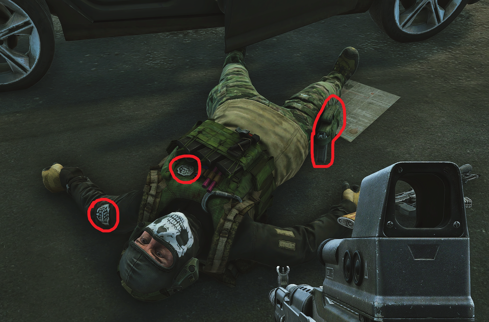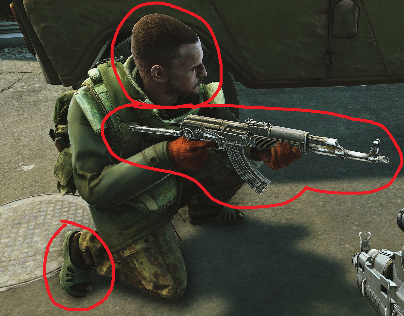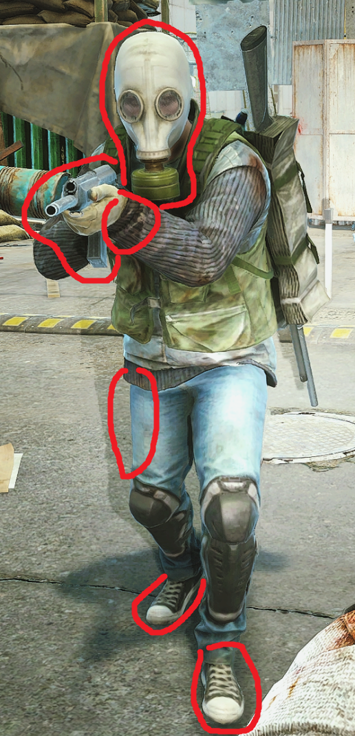 동구권 총, 더러운 장화, 권총 홀스터 없음(옆 주머니와 혼동 주의), 헤드셋과 헬멧이 없음 = 스캐브