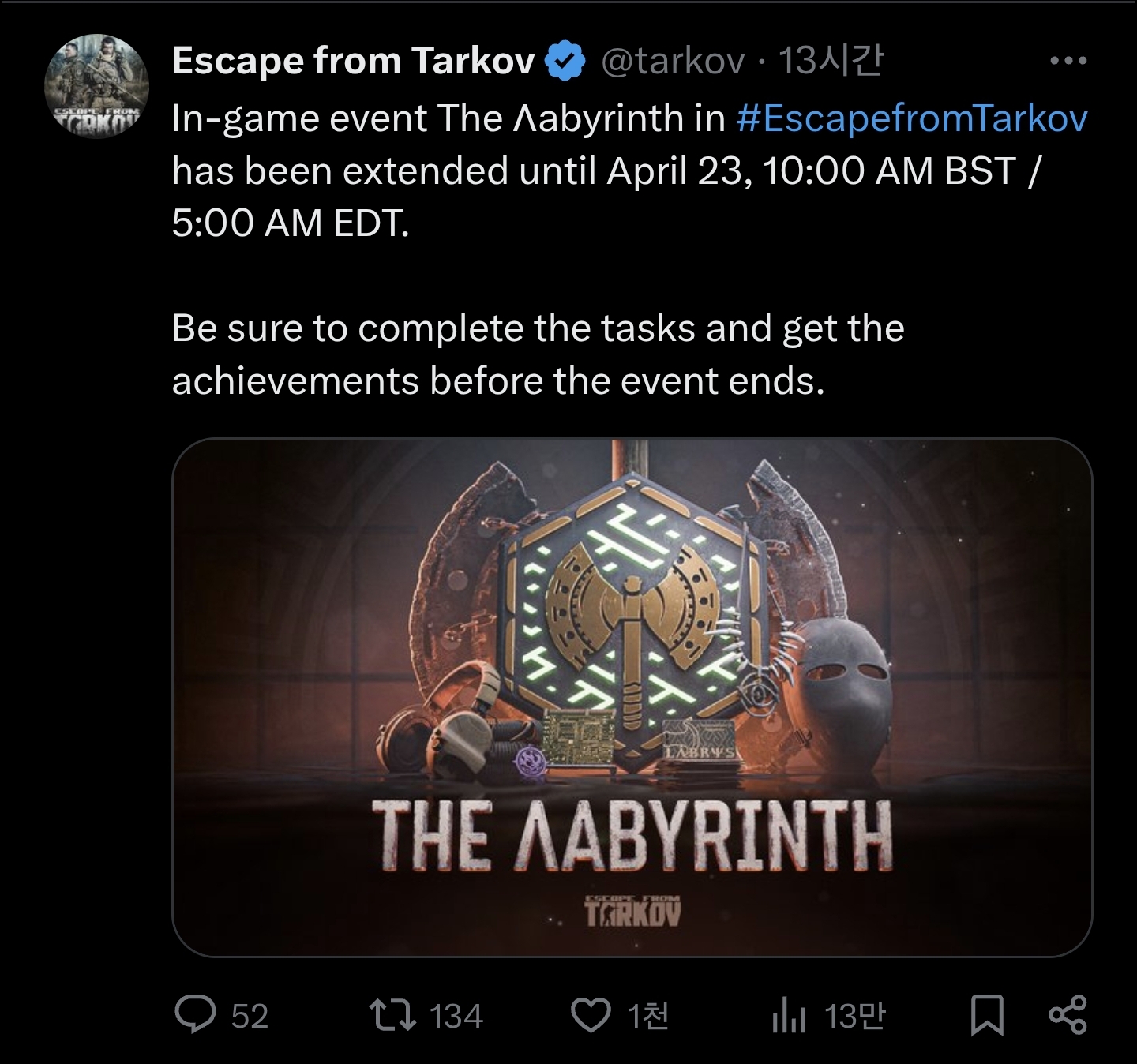 | 타르코프 미궁 이벤트 종료일 공지 (1) | 2025.04.08 |
