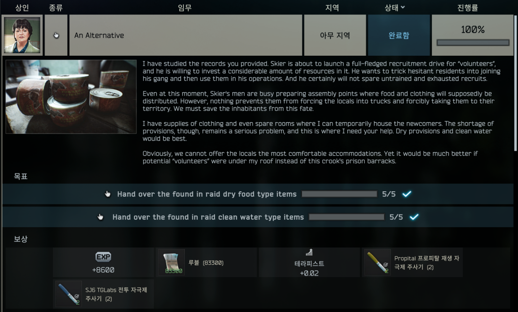 퀘스트 제출 할 수 있는 아이템은 아래 표와 같습니다. 건조 음식 종류 5개, 깨끗한 물 종류 5개를 구해서 테라피스트에게 주면 됩니다. 인레이드 마크가 있어야 합니다.