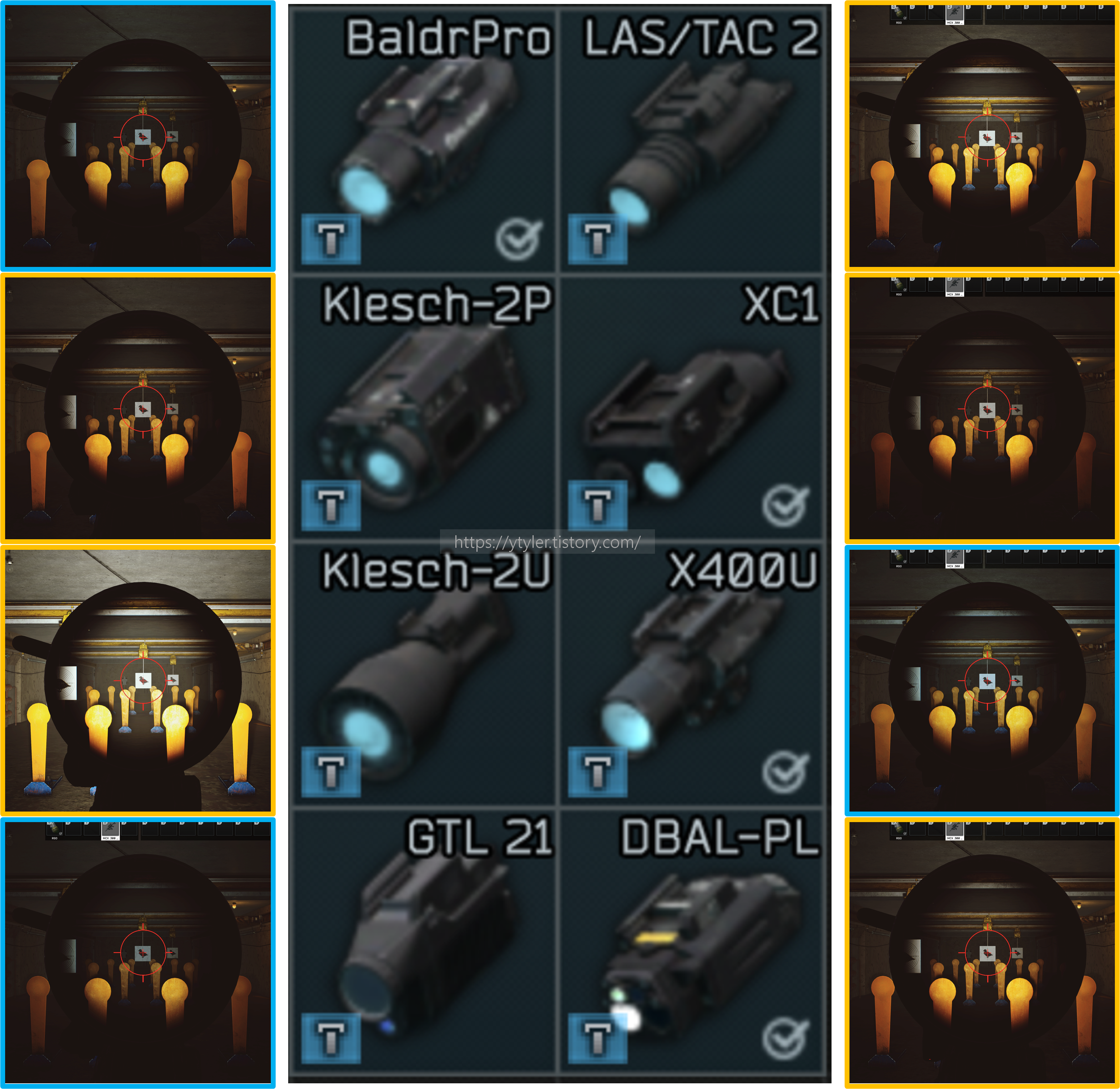타르코프에서 자주 사용하는 전술 조명(Tactical combo devices, Flashlight)들은 광량이 조금씩 다릅니다. 광량도 개인별로 선호하는 정도가 있는데요. 전술 조명 선정에 도움을 드리고자 광량을 정리해 보았습니다. 정리하면서 알게 되었는데, 타르코프의 플래시라이트는 광량뿐 아니라 색온도도 있더라고요. 세세하게는 구분하기 어렵지만 황백색(전구색, 높은 색온도)과 청백색(주광색, 낮은 색온도)으로 구분해 보았습니다.