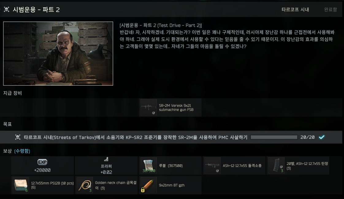- 타르코프 시내(Streets of tarkov), 그라운드 제로(Ground Zero), 인터체인지(Interchange)에서 소음기와 KP-SR2 조준기를 장착한 SR-2M으로 PMC 20명을 사살하세요.