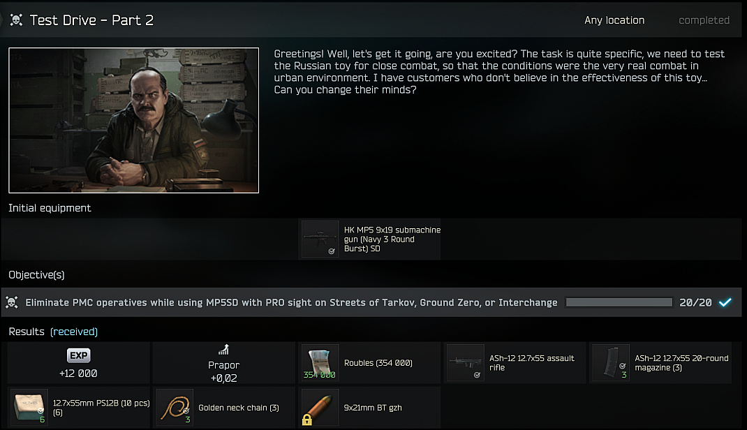 - 타르코프 시내(Streets of tarkov), 그라운드 제로(Ground Zero), 인터체인지(Interchange)에서 PRO Sight를 장착한 MP5SD로 PMC 20명을 사살하세요.