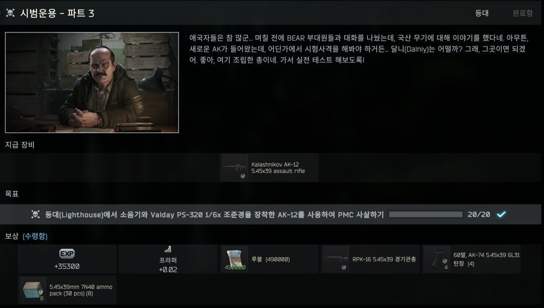 - 등대(Lighthouse)에서 소음기와 Valday PS-320 1/6x 조준경을 장착한 AK-12로 PMC 20명을 사살하세요.