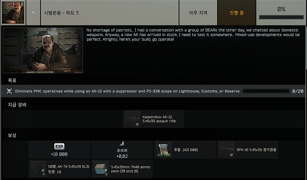 - 등대(Lighthouse), 세관(Customs), 리저브(Reserve)에서 소음기와 Valday PS-320 1/6x 조준경을 장착한 AK-12로 PMC 20명을 사살하세요.