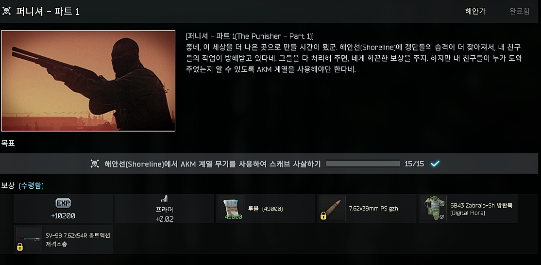 - 해안선(쇼어라인·Shoreline)에서 AKM 계열 무기를 사용하여 스캐브 15명을 사살하세요.