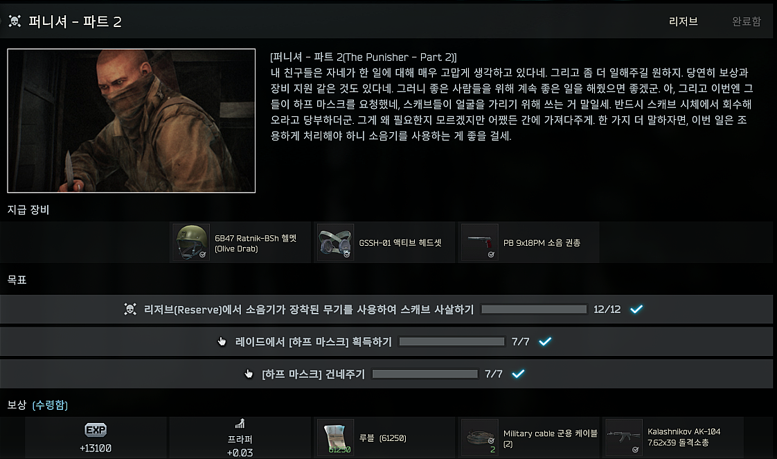 - 리저브(Reserve)에서 소음기가 장착된 무기를 사용하여 스캐브 12명을 사살하세요.