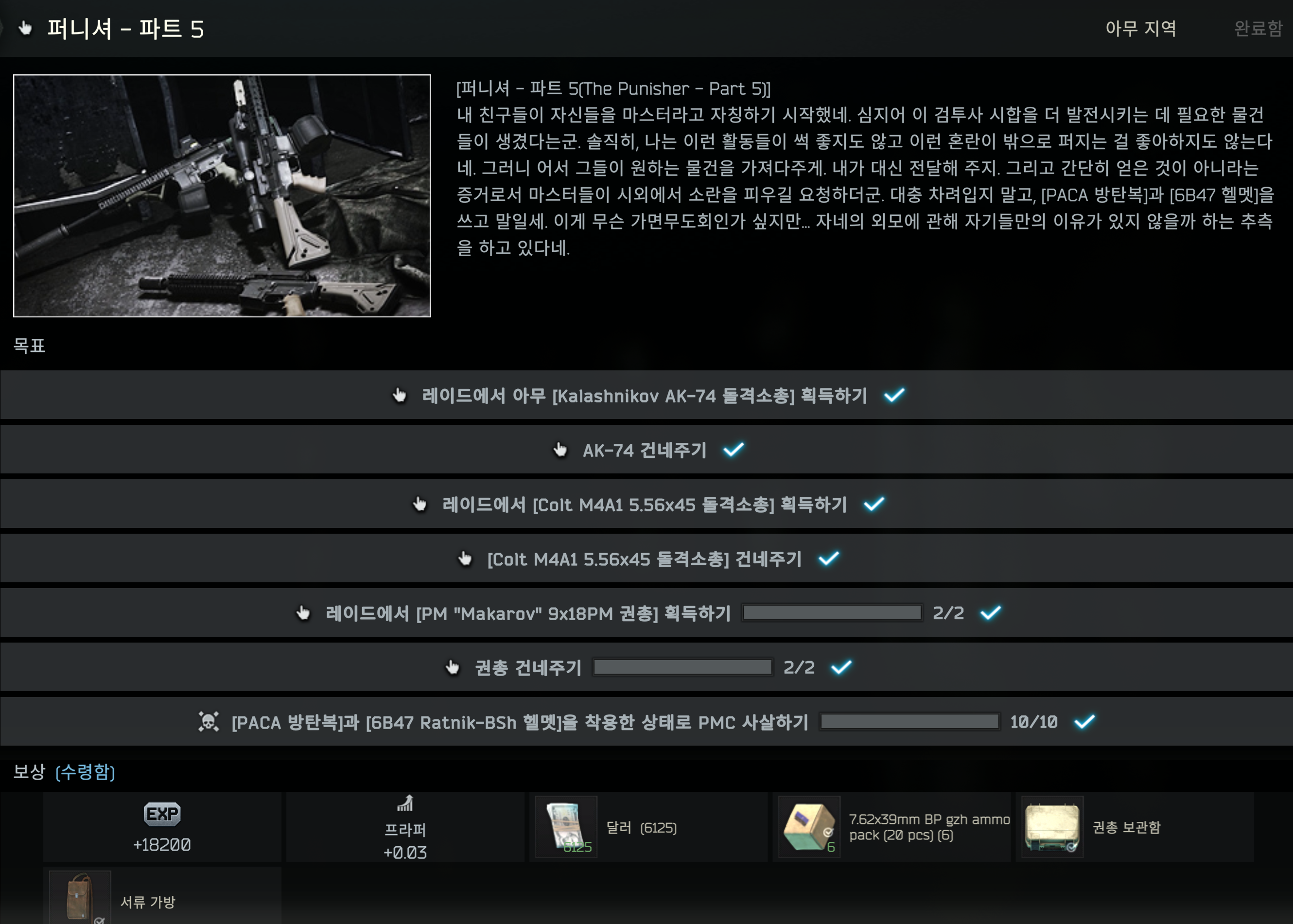 - [PACA 방탄복]과 6B47 Ratnik-BSh 헬멧]을 착용한 상태로 PMC 10명을 사살하세요.