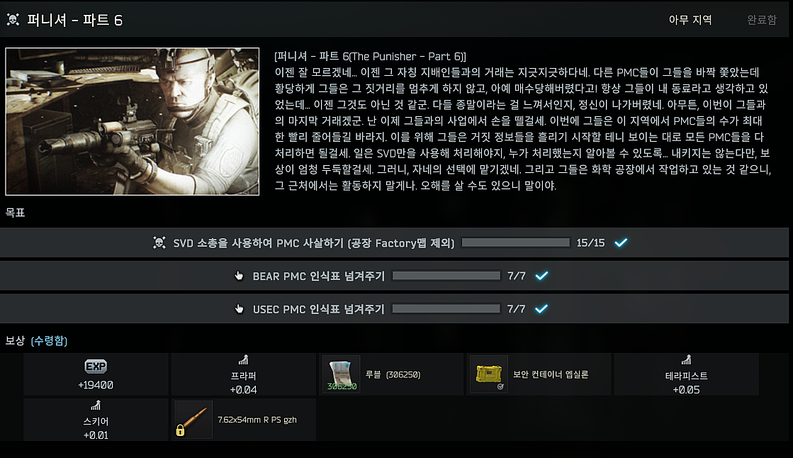 - [SVD] 소총을 사용하여 PMC 15명을 사살하세요.