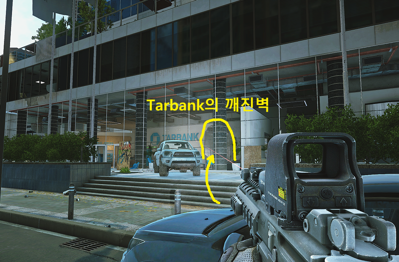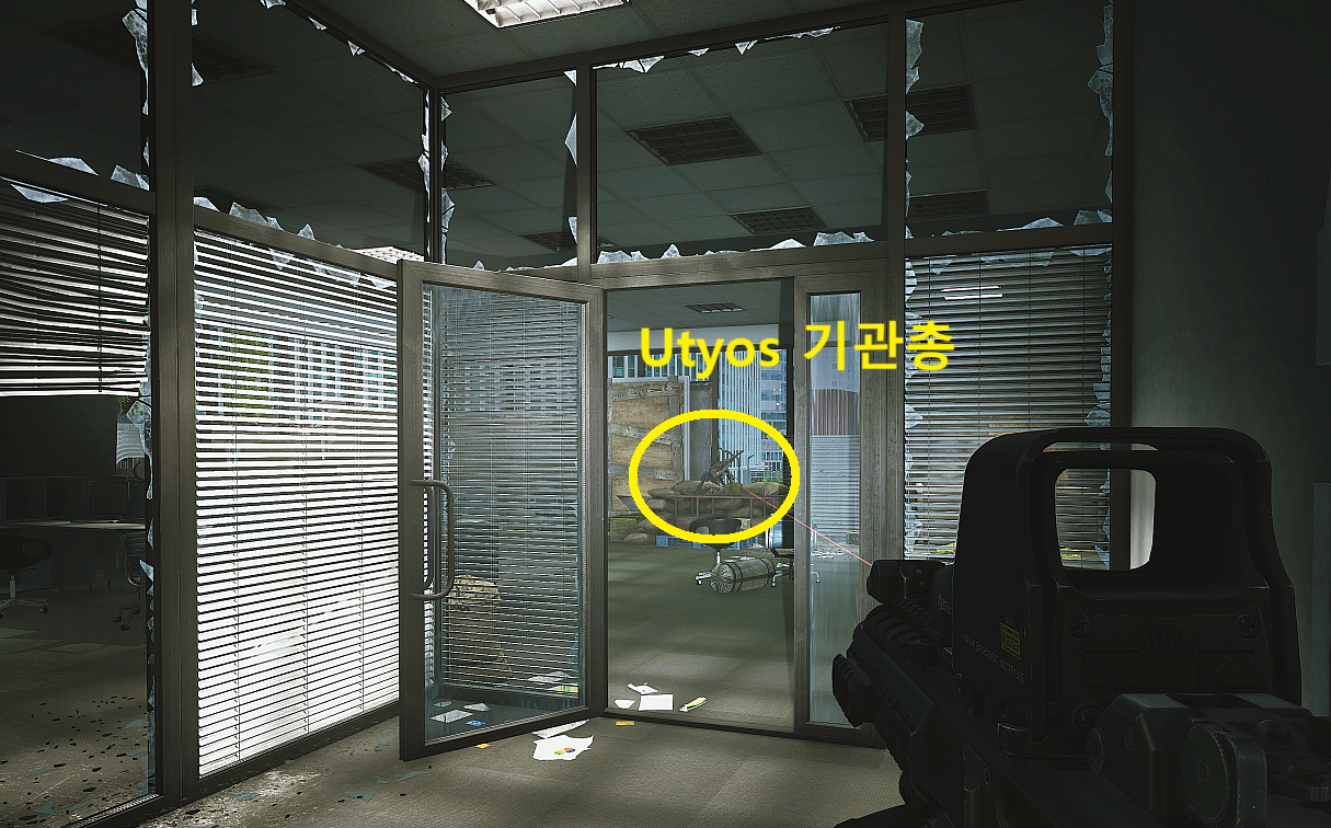 Utyos 기관총에서 우측으로 보이는 바깥이 택시 탈출구와 Terragroup 빌딩입니다.