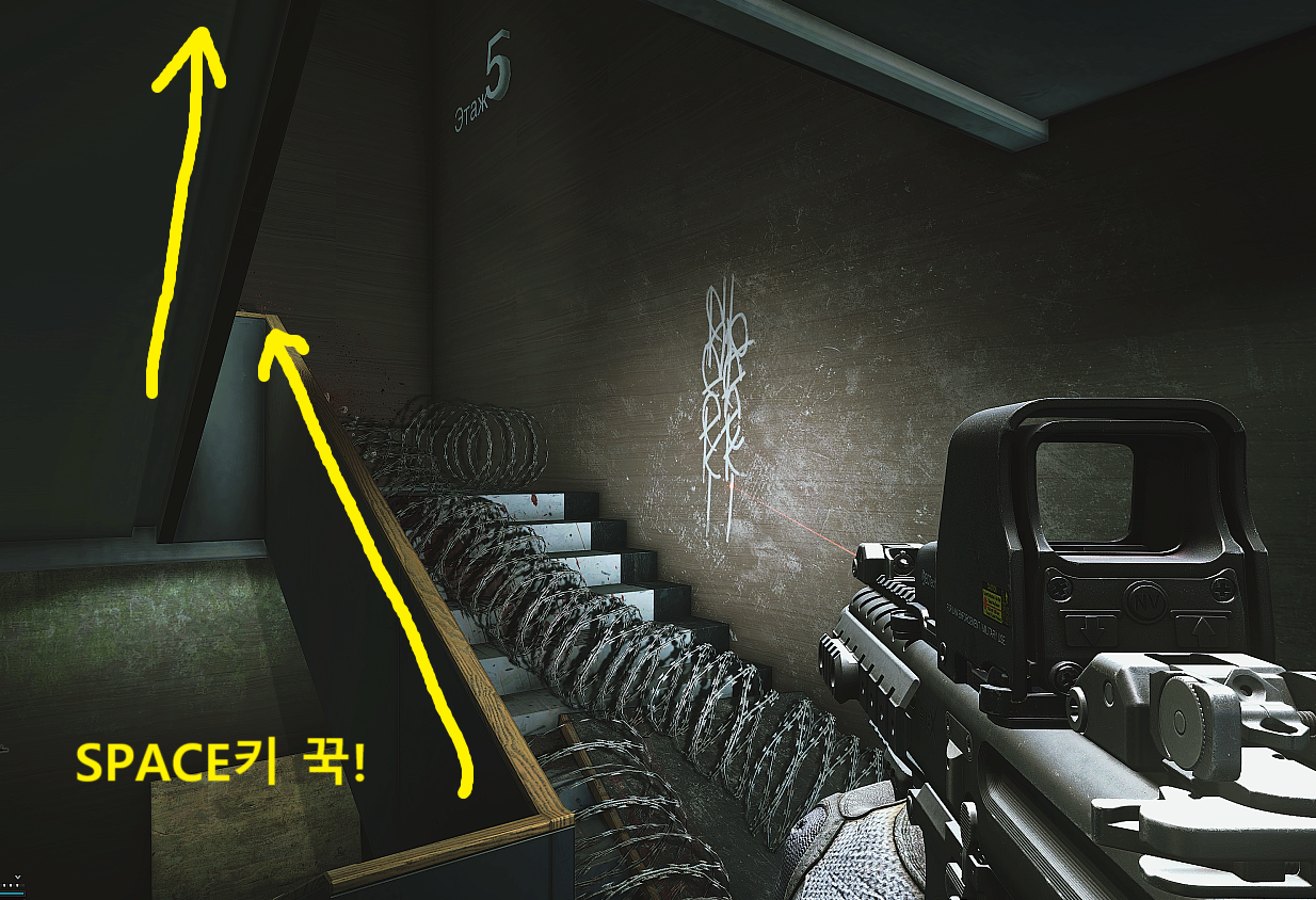 5층 앞에서 철조망이 보입니다. 계단 난간을 바라보고 SPACE키를 길게 누르면 파쿠르가 되어 난간에 올라갈 수 있습니다.