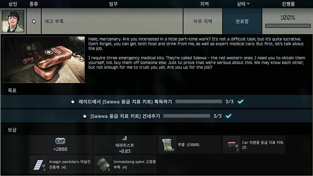 레이드에서 Salewa 응급 치료 키트를 구해야 합니다. 죽어서 인레이드 마크(Found in raid mark)가 없어지면 퀘스트로 제출하지 못하기 때문에 구하면 꼭 무사히 탈출하는 것을 목표로 하셔야 합니다.