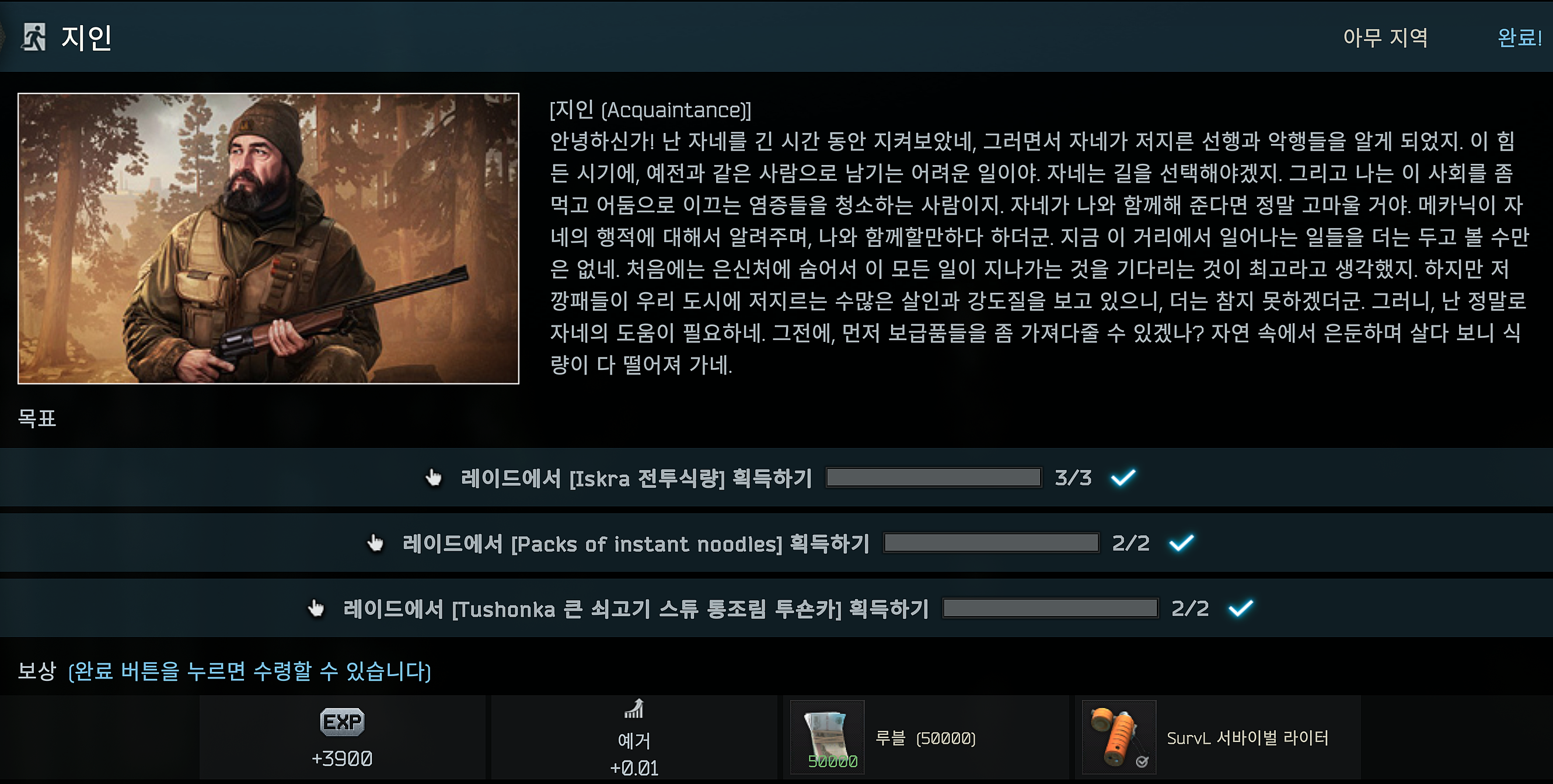 레이드에서 [Iskra 전투식량] 3개, [Pack of instant noodles] 2개, [Tushonka 큰 쇠고기 통조림 투숀카] 2개를 구해야 합니다. 죽어서 인레이드 마크(Found in raid mark)가 없어지면 퀘스트로 제출하지 못하기 때문에 구하면 꼭 무사히 탈출하는 것을 목표로 하셔야 합니다.