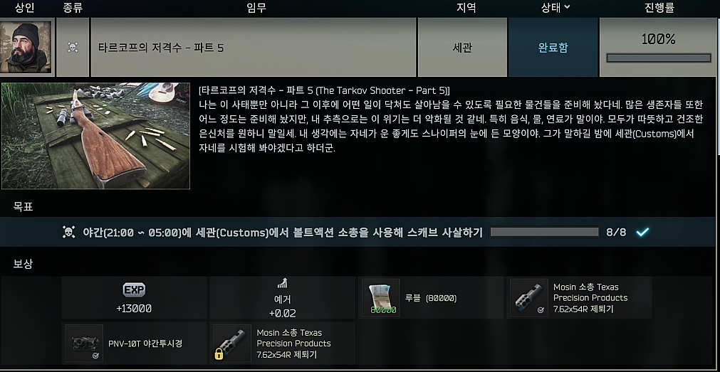 - 야간(21:00 ~ 05:00)에 세관(Customs)에서 볼트액션 소총을 사용해 스캐브 8명 사살하세요.