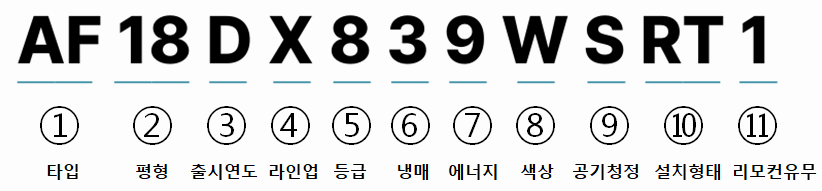 에어컨은 여러가지 형태가 있죠. 그 형태를 표현합니다. A는 air 즉 공기와 관련되었음을 뜻하고 있으며, F는 스탠드형(Floor standing air conditioner), R은 벽걸이형(Room air conditioner)을 뜻합니다. AF타입은 2in1타입을 포함합니다.