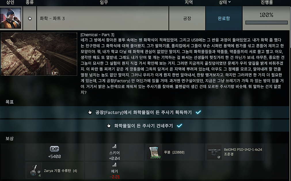타르코프 퀘스트 - 화학 - 파트 3 (Chemical - Part 3) 본문