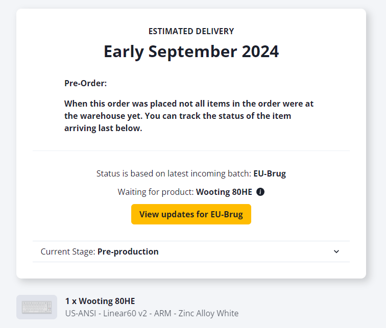우팅(Wooting)은 배송도 극악으로 유명했습니다. 저는 지난 주말에 아연 합금 케이스로 화이트 제품을 구매하여 기다리고 있는데요. 무려 배송 예상일이 9월을 가리키고 있습니다. 배송이 되면 제품을 리뷰해 보도록 하겠습니다.