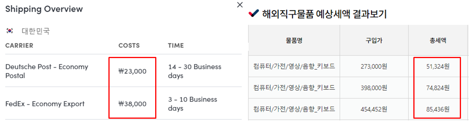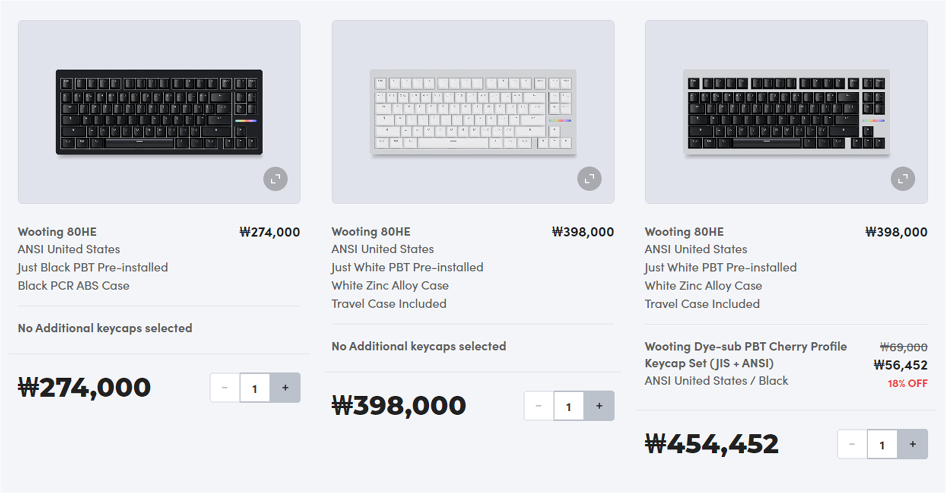 기본 옵션으로만 구성시 274,000원이며 아연 합금 케이스 선택 시 398,000원, 추가 체리 프로파일 키캡 등 추가 옵션을 선택하면 최고 454,452원까지 올라갑니다. 여기에 배송비와 관세까지 포함하면 거의 10만 원이 추가될 수 있습니다.