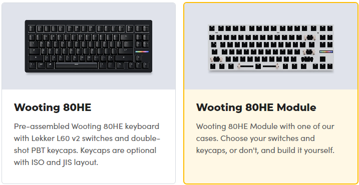 Wooting 80HE는 완제품도 판매하지만 모듈도 판매하고 있습니다. 커스텀 키보드를 즐기는 분들은 모듈만 구매하여 자신만의 Wooting을 꾸며볼 수 있겠습니다.