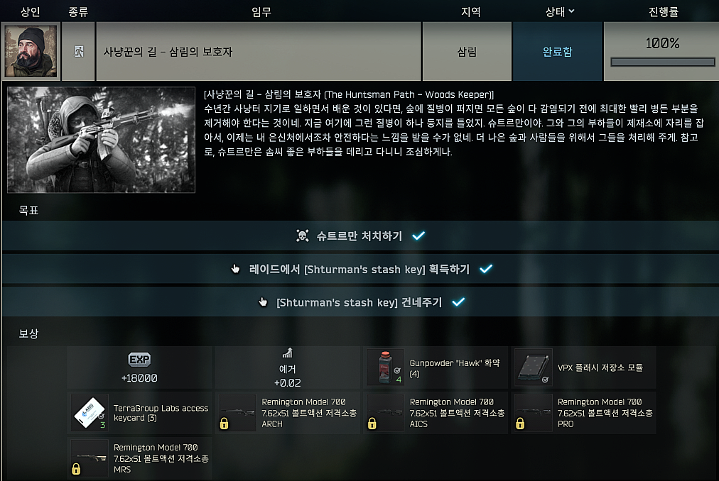 타르코프 퀘스트 - 사냥꾼의 길 - 삼림의 보호자 (The Huntsman Path - Woods Keeper)