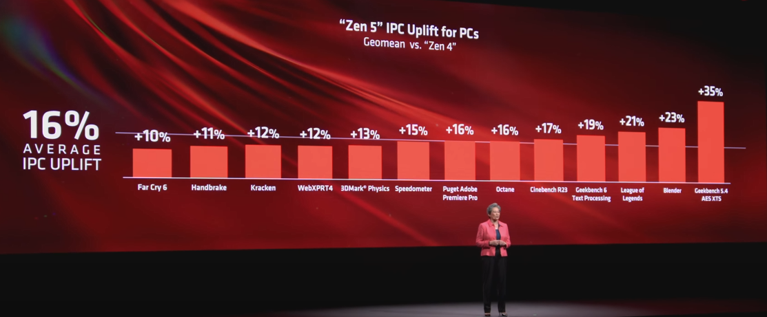 AMD의 CEO, 리사 수 박사는 기조연설 직후 Desktop Gaming PC 제품에 적용될 Zen5 아키텍처를 소개했습니다. Zen5 아키텍처는 Zen4대비 IPC*가 16% 향상되었으며, 이를 바탕으로 만들어지는 라이젠(Ryzen) 9000시리즈는 총 4개 제품으로 오는 7월에 출시할 예정입니다. (9950X, 9900X, 9700X, 9600X)