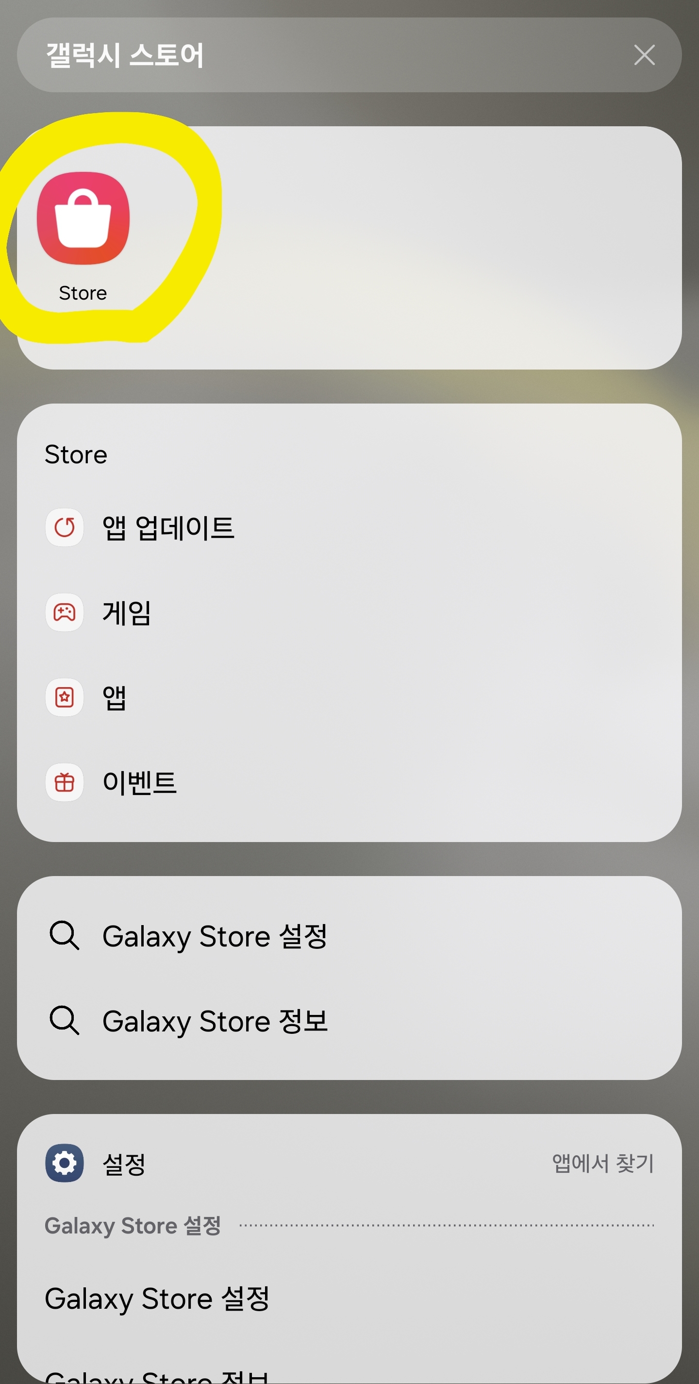 우선 스마트폰에서 갤럭시 스토어를 검색하시면 Store라는 앱이 검색이 됩니다. 많이 사용하시는 구글 플레이스토어와 같은 기능을 가진 삼성에서 운영하는 앱스토어입니다.
