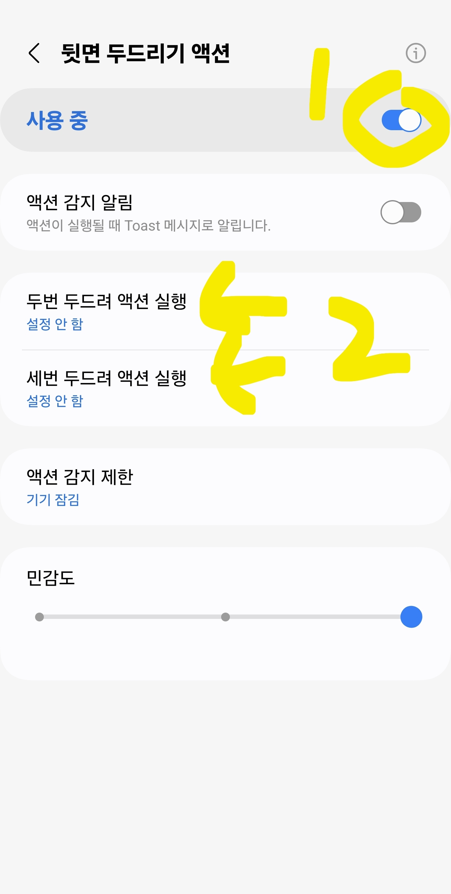 먼저 사용 중 버튼을 활성화시켜 주고, 두번 두드릴지 세번 두드릴지를 선택해서 눌러줍니다.