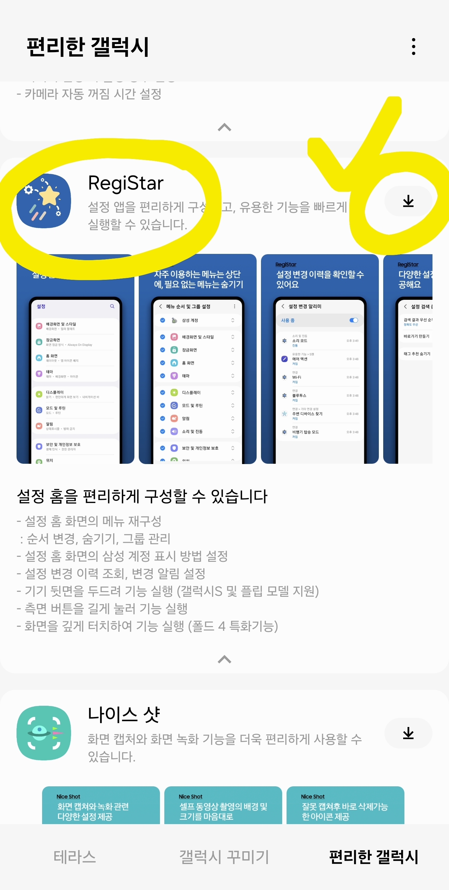 '편리한 갤럭시' 탭에서 아래쪽으로 내려보면 RegiStar라는 기능이 있는데요. 설치해 줍니다.