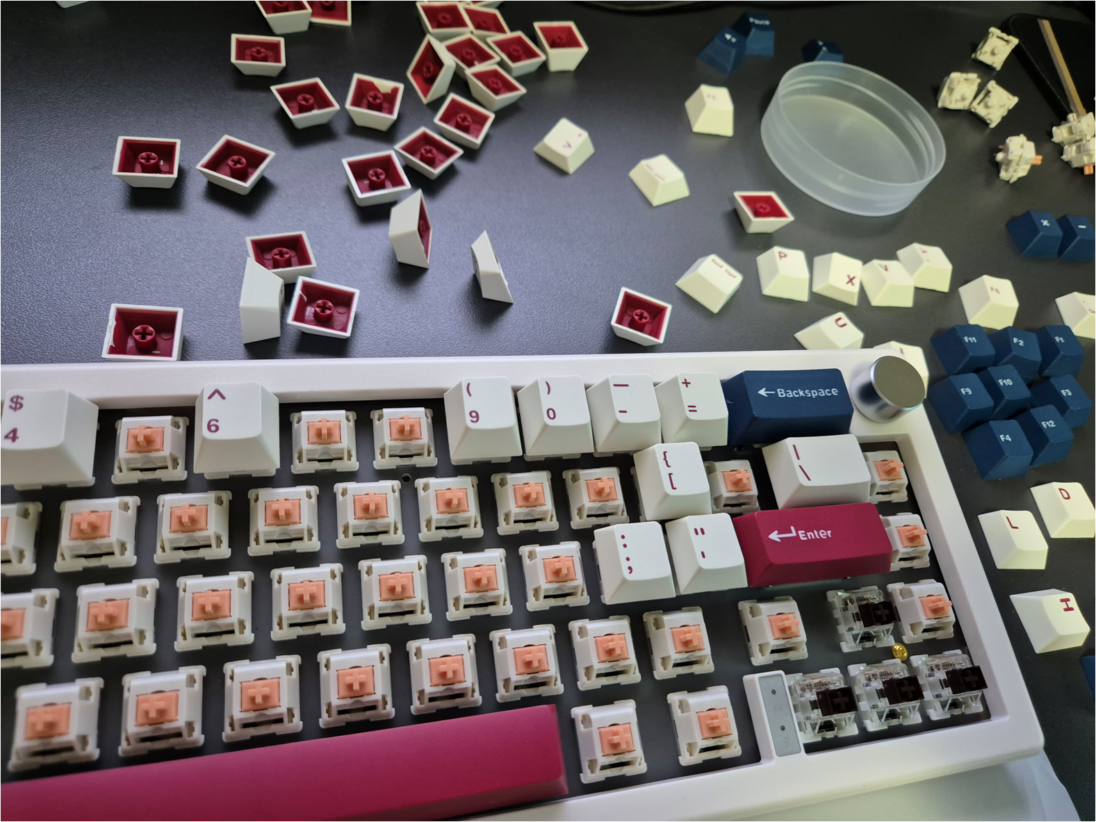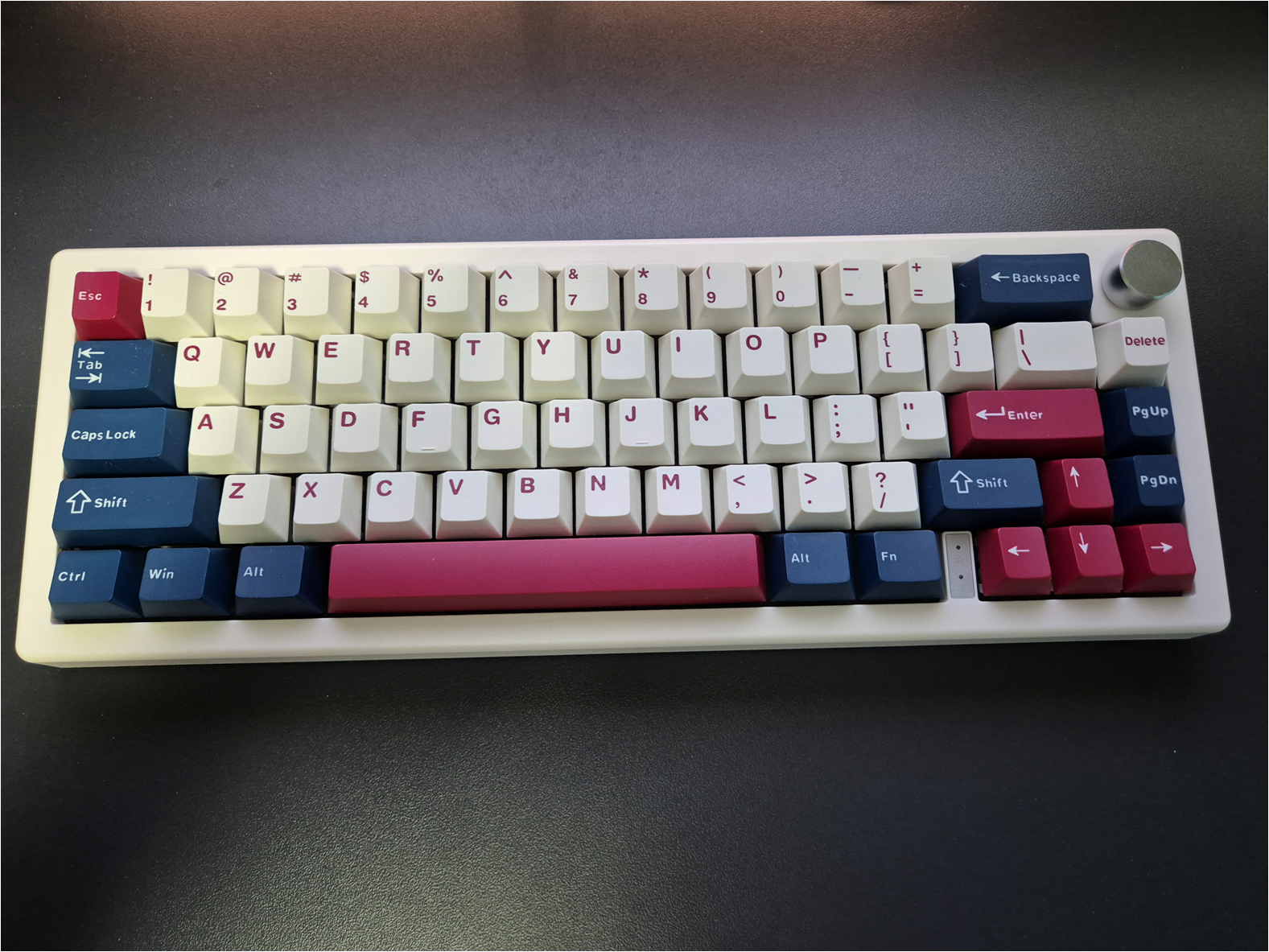 키캡 장착을 완료했습니다. 꽤 그럴싸한 외관의 오밀조밀한 키보드가 완성되었습니다. 나름 볼륨조절 노브도 있습니다.