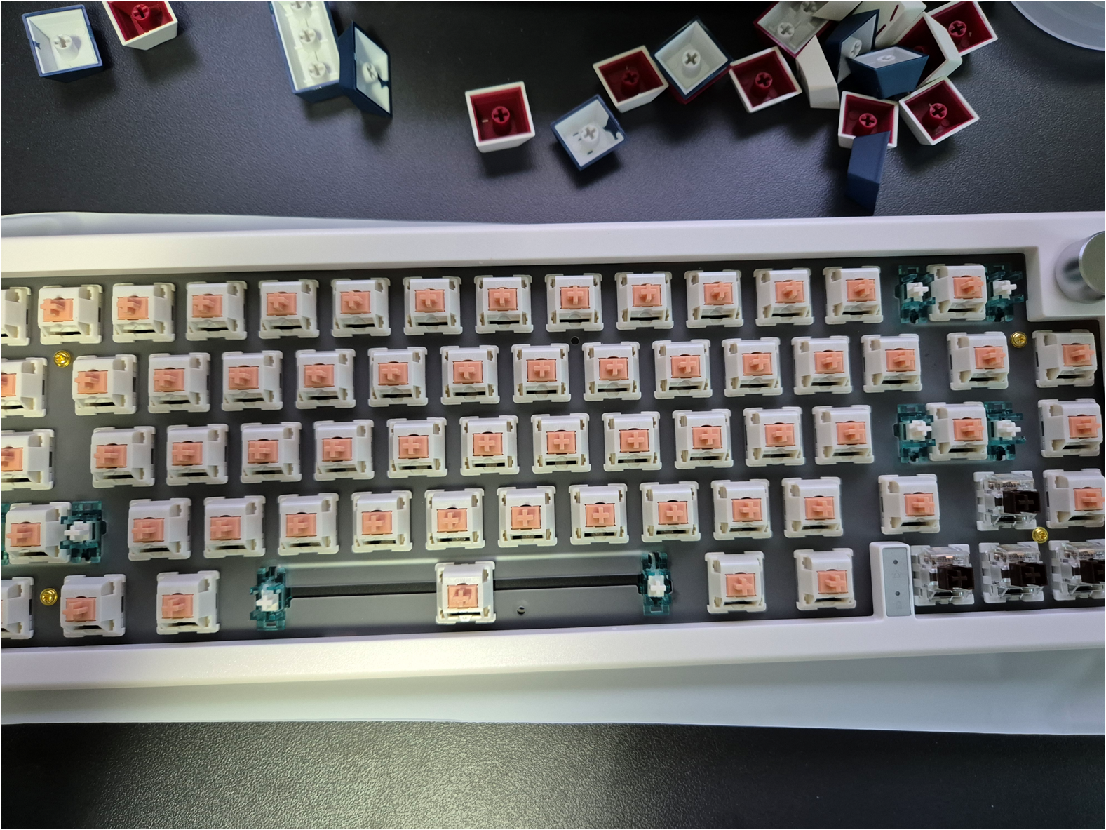 스위치를 모두 장착했습니다. 저는 개인적으로 좀 더 타건감이 재미있다고 느껴진 홀리팬더 스위치를 메인으로 장착하고 비교를 위해 방향키에는 오테뮤 갈축을 장착했습니다.