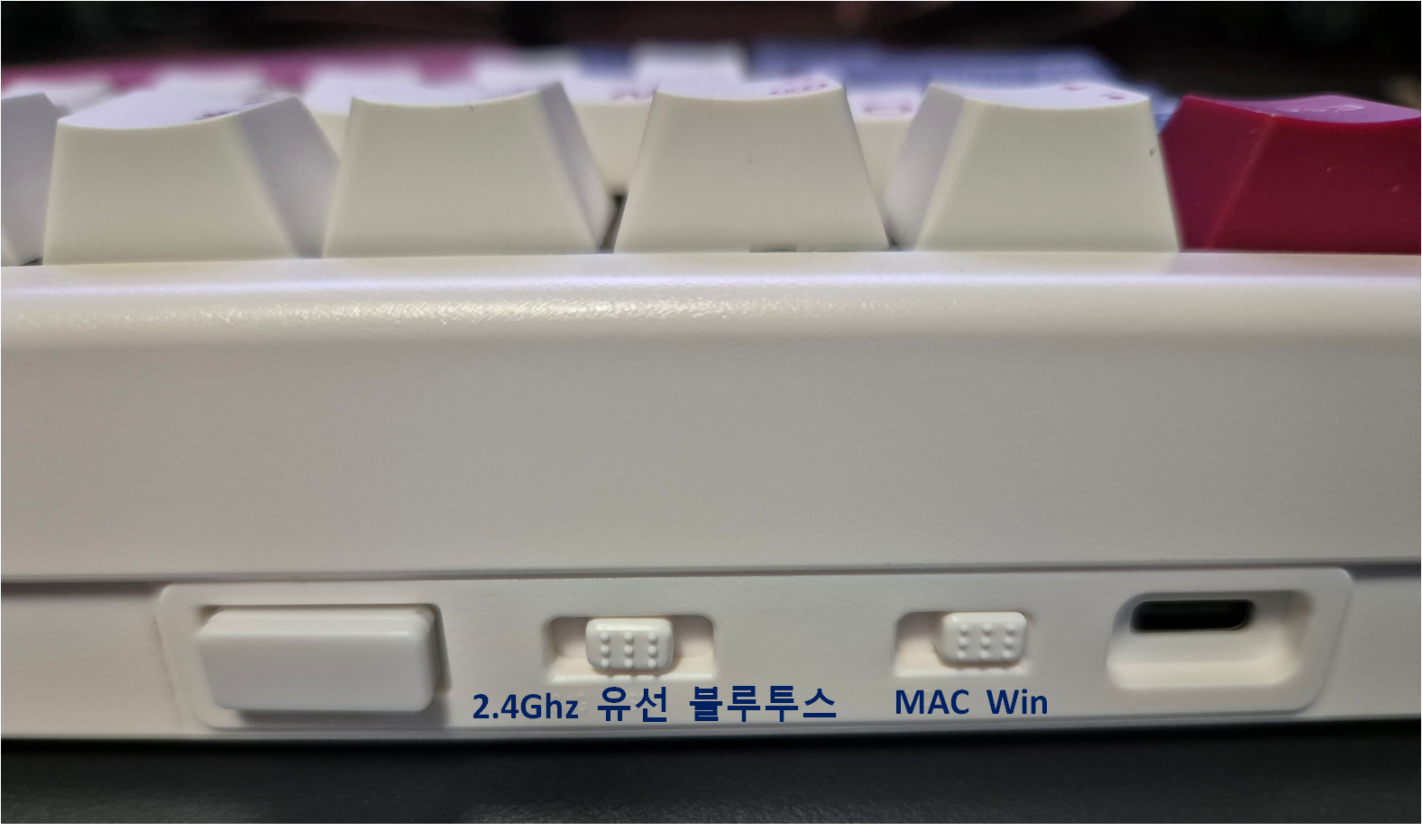 연결방법은 독거미 키보드와 유사하게 매우 편합니다. 2.4 Ghz 동글, 유선, 블루투스를 지원하고, 윈도우와 맥 전환도 가능합니다. 이제 타건음을 들려드리겠습니다.