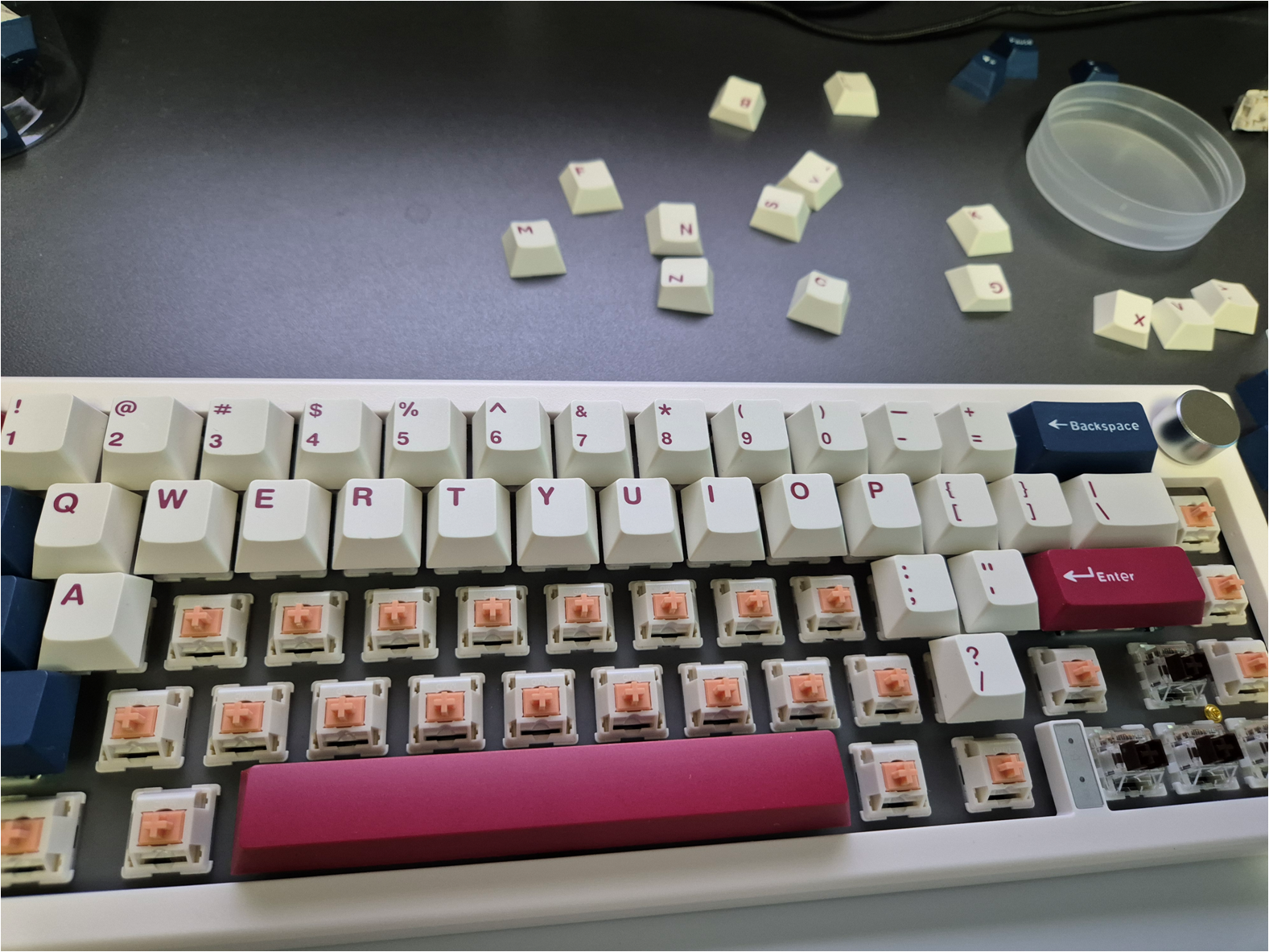 키캡도 장착해주겠습니다. 126 키 기준으로 나온 키캡이라 남는 키캡이 많았습니다. 67퍼센트 배열의 GMK67은 거이 절반 정도만 사용하였습니다. 싸구려 키캡이었지만 독거미 키보드에 들어간 키캡과 질감은 동일하였습니다.