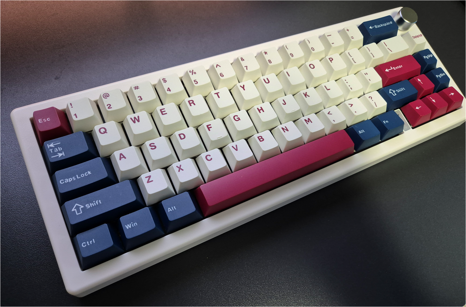 키캡 장착을 완료했습니다. 꽤 그럴싸한 외관의 오밀조밀한 키보드가 완성되었습니다. 나름 볼륨조절 노브도 있습니다.