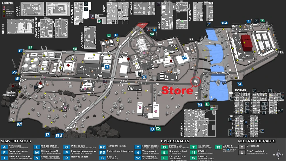 BTR 정류장 명칭별 위치입니다. 1. 우드·삼림(Woods)Sunken village : 폐허마을Old Sawmill : 통신기지(구 제재소)Train Depot : 기차역(기차 창고)Scav Bunker : 라디오 타워, 스캐브 벙커USEC Checkpoint : 검문소Sawmill