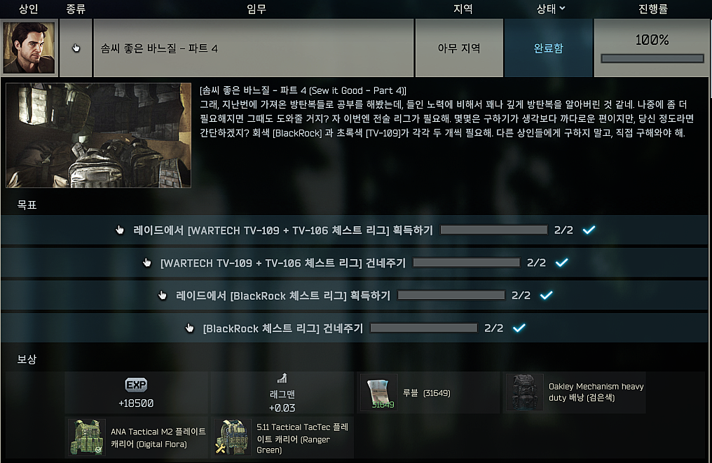 레이드에서 [WARTECH TV-109 + TV-106 체스트 리그]와 [BlackRock 체스트 리그]를 2개씩 구해야 합니다. 죽어서 인레이드 마크(Found in raid mark)가 없어지면 퀘스트로 제출하지 못하기 때문에 구하면 꼭 무사히 탈출하는 것을 목표로 하셔야 합니다.