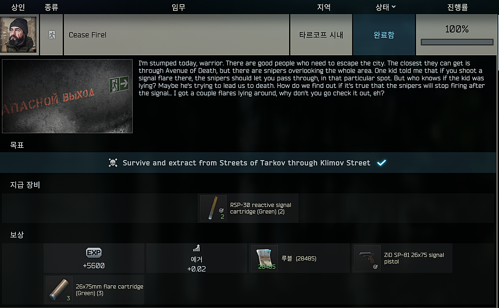 타르코프 시내(Streets of Tarkov)에 있는 플레어 탈출구를 이용해 탈출하면 됩니다.