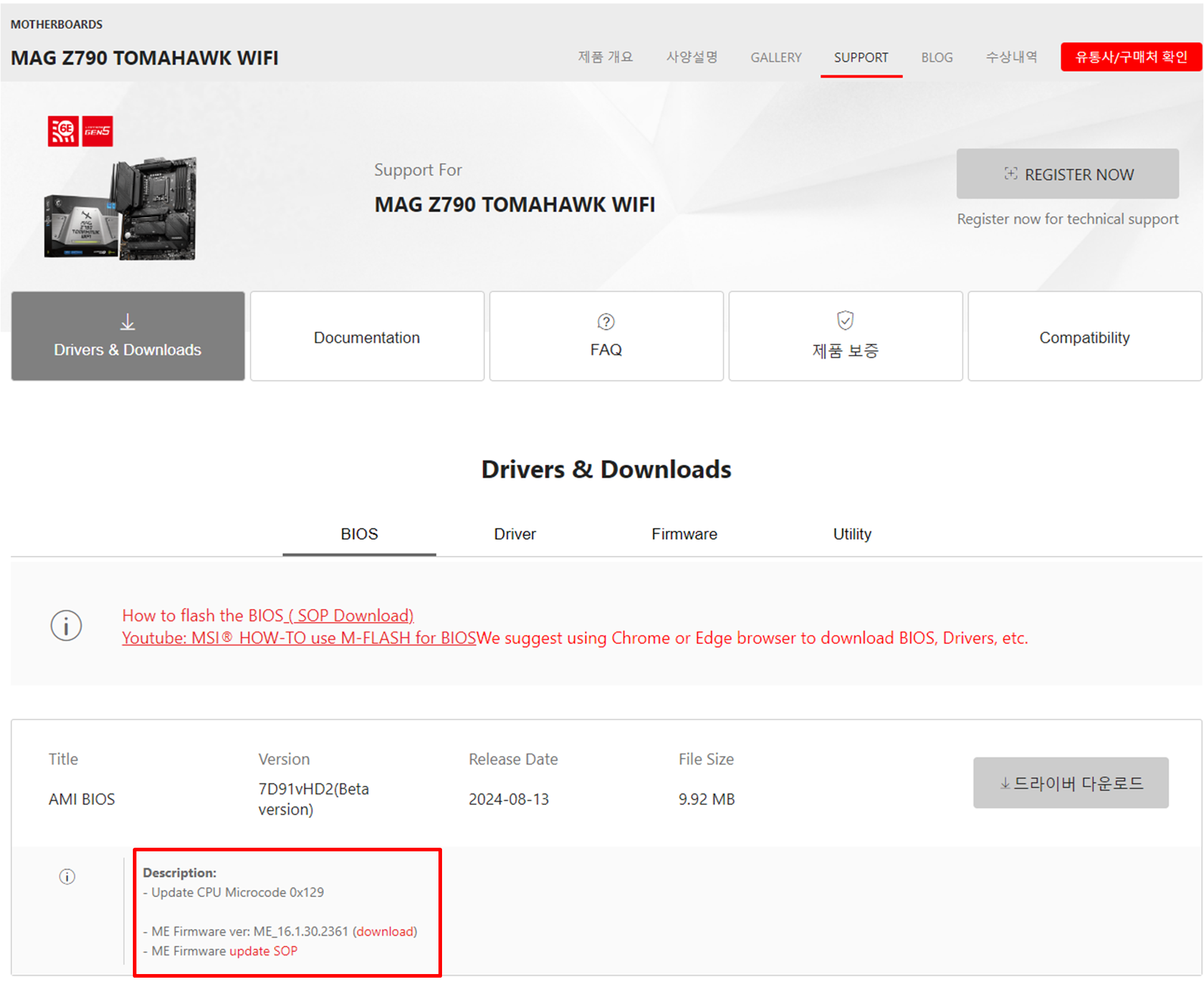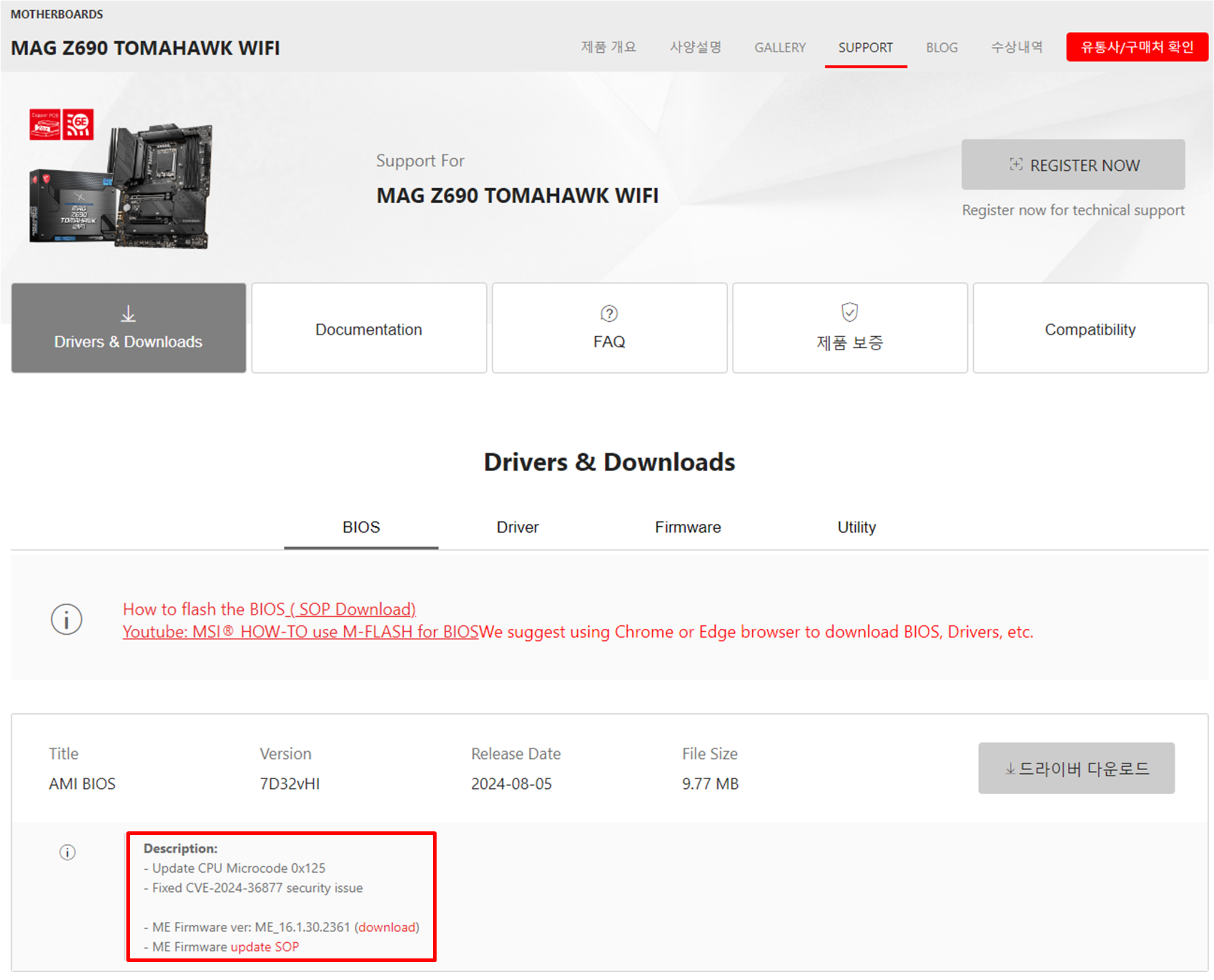 MSI의 경우 Z790 토마호크 제품은 이미 패치가 올라와 있지만, Z690 토마호크 제품은 아직 패치가 올라와 있지 않습니다.(2024.08.14 현재기준) 아마 곧 600번대 제품도 패치 파일 업데이트가 올라올 것으로 예상됩니다.