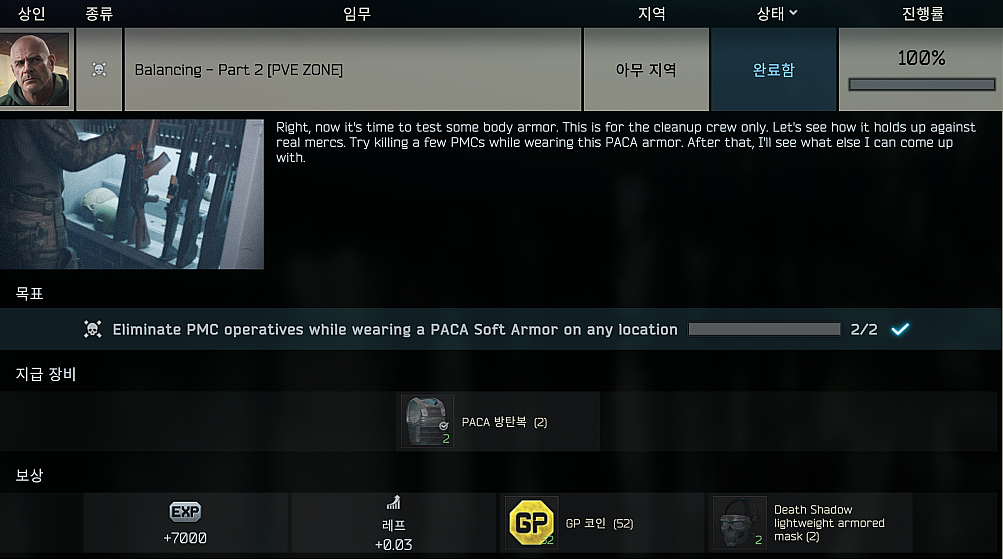 - PACA Soft Armor를 착용한 상태로 PMC 2명을 사살하세요.