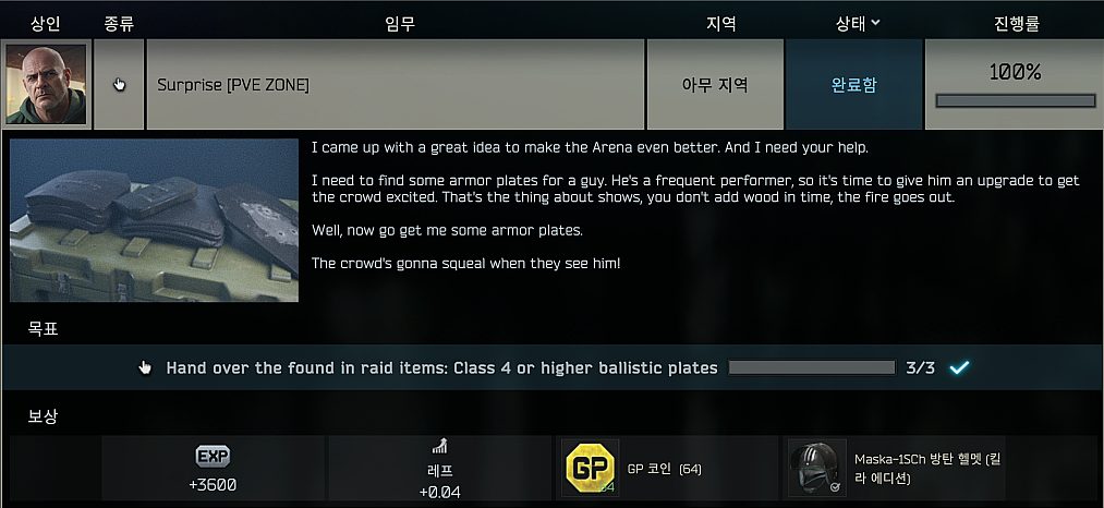 레이드에서 [4클래스 이상의 방탄판] 3개를 구해야 합니다. 죽어서 인레이드 마크(Found in raid mark)가 없어지면 퀘스트로 제출하지 못하기 때문에 구하면 꼭 무사히 탈출하는 것을 목표로 하셔야 합니다.