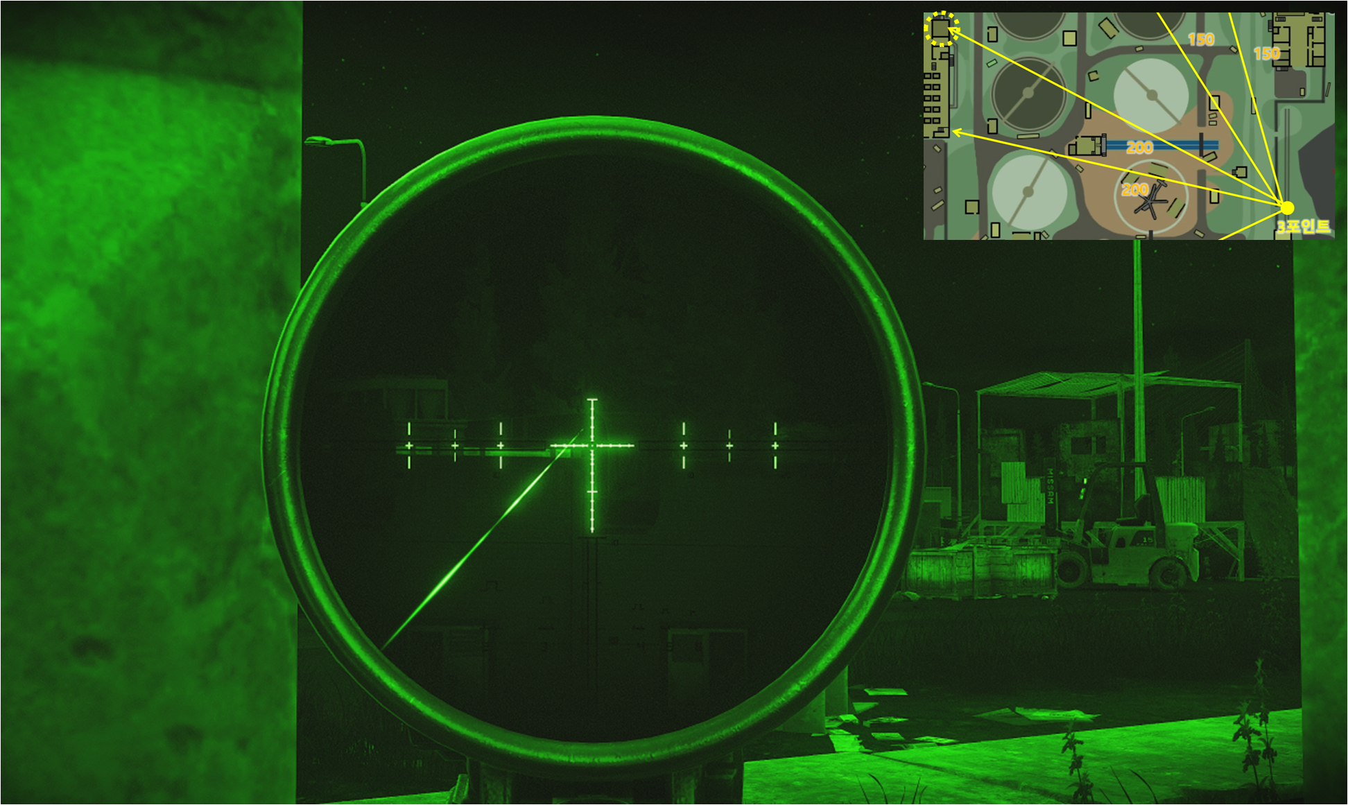 우선 입구 초소, 제1과 제2사격 포인트에서 더블 체크 했기 때문에 있을 가능성은 낮지만 혹시 모르니 한번 확인은 하고 넘어가겠습니다. 혹시 남아 있다면 영점을 200 잡고 쏴주면 되겠습니다.