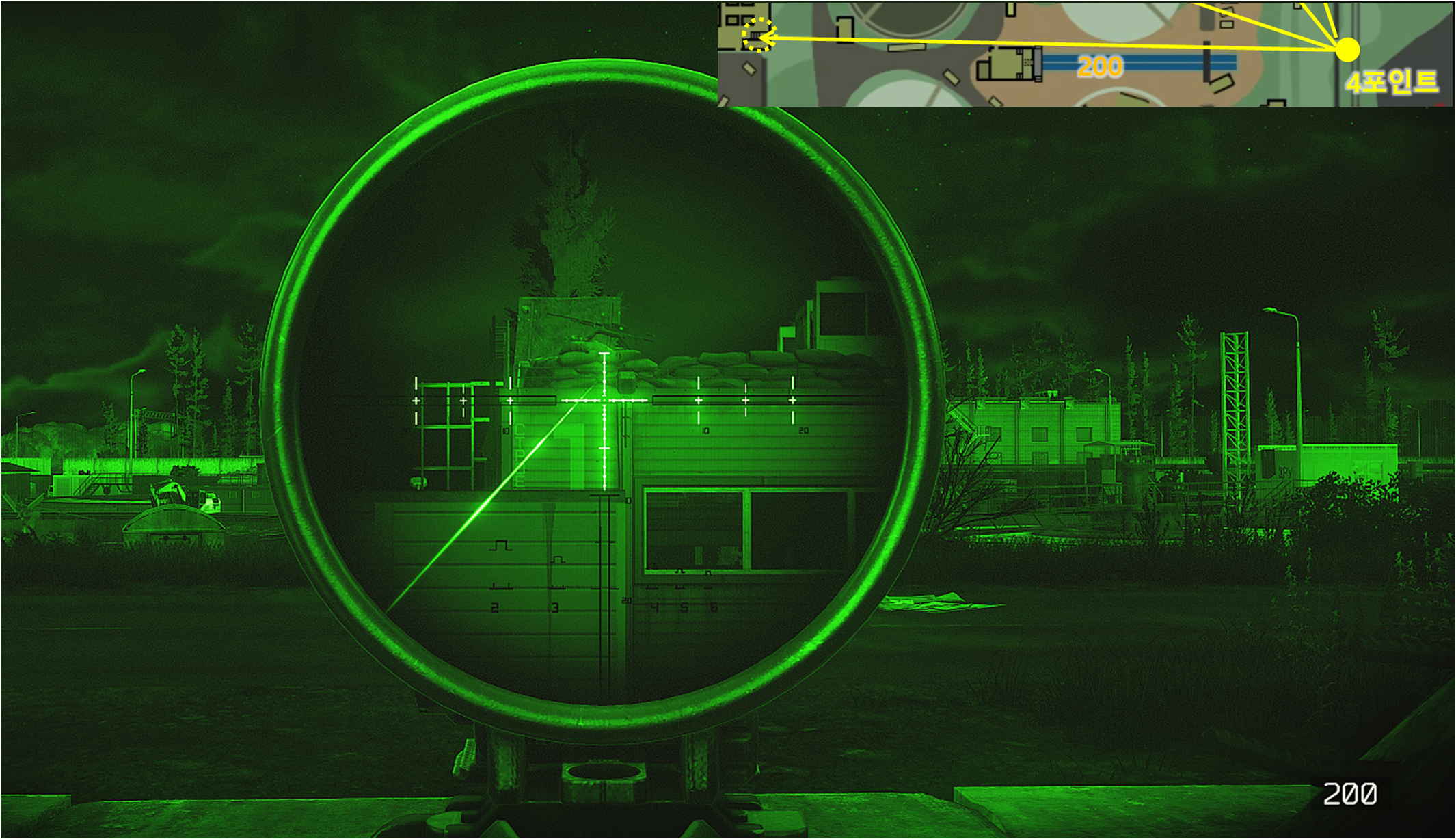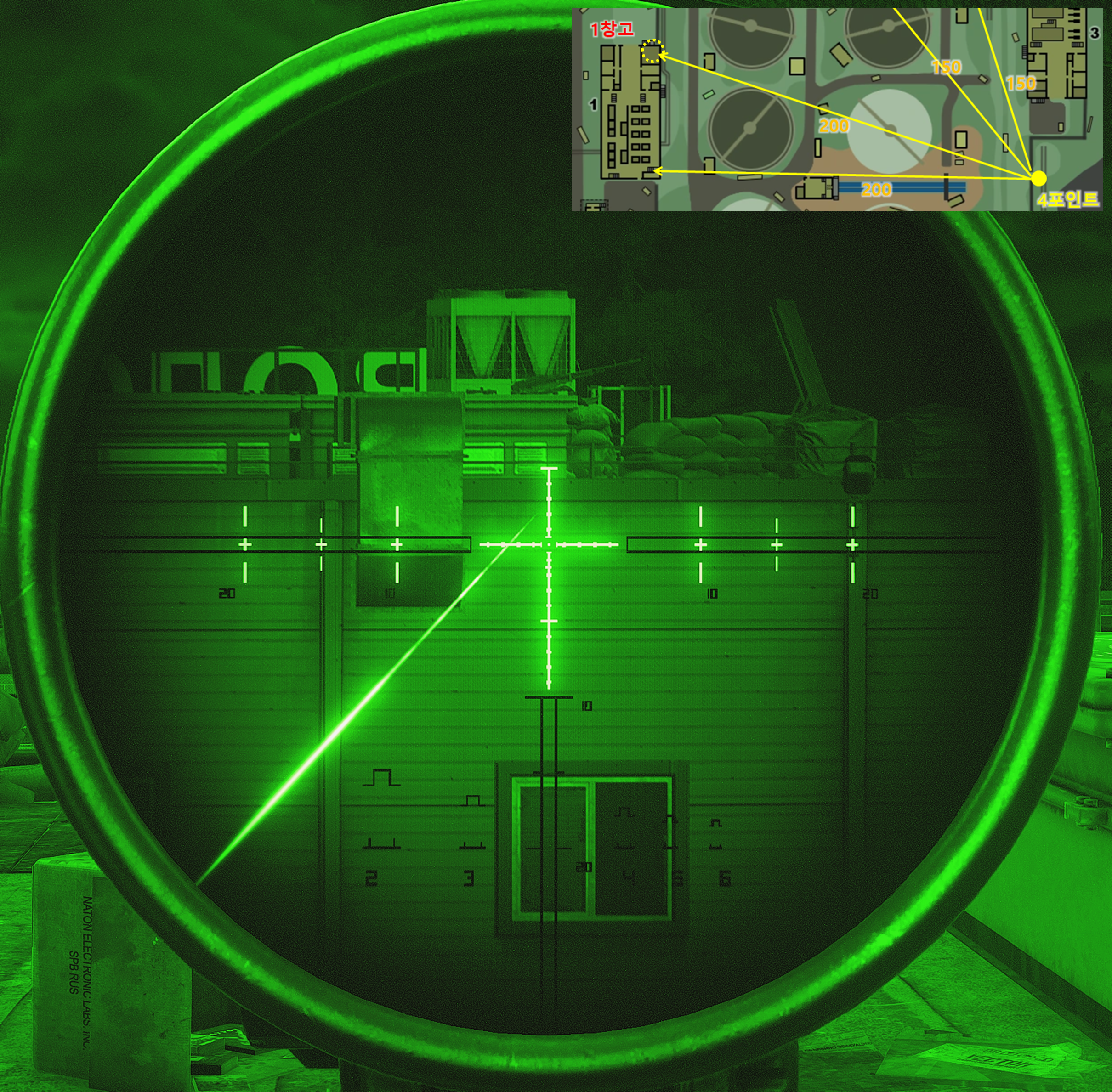 역시 1창고 남측부터 노려 줍시다. 4포인트는 시야가 매우 좋습니다. 로그가 보인다면 영점 200으로 쏴주시면 됩니다.