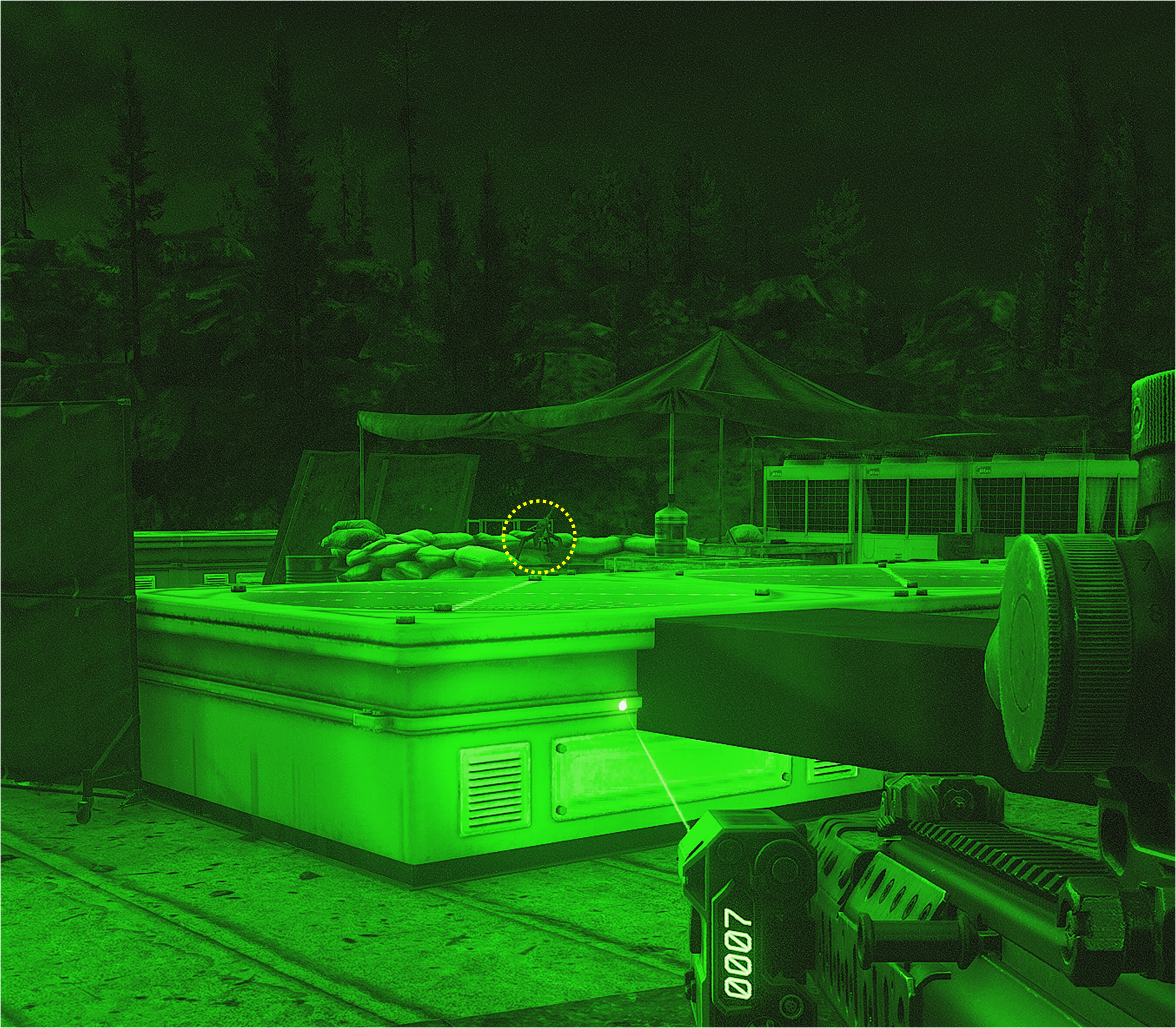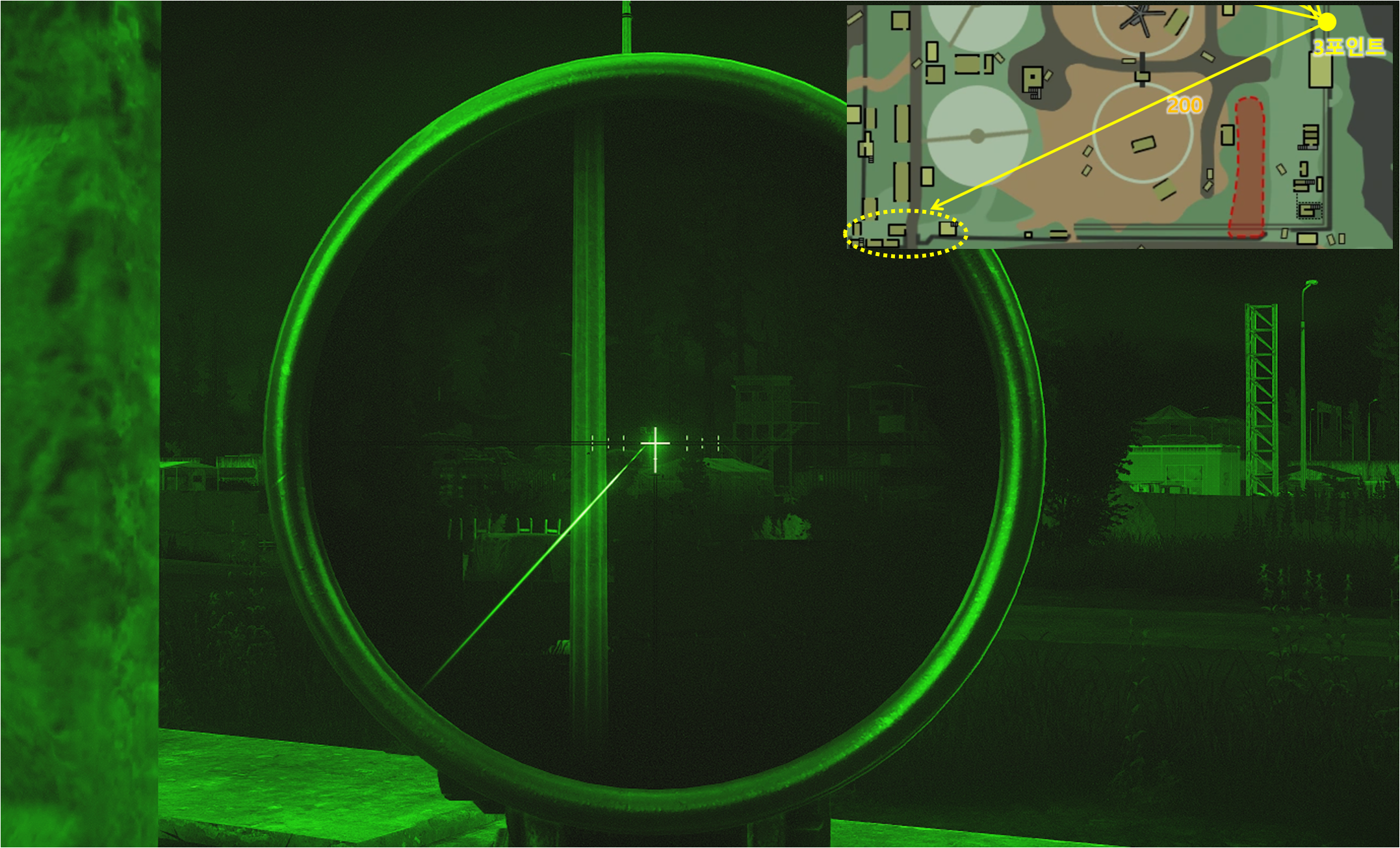 같은 자리에서 우측으로 고개를 돌려 1번 창고를 봅시다. 크게 "1"이라고 적혀 있는 건물인데요. 숫자 바로 위에 기관총이 있습니다. 여기도 로그가 있다면 영점을 200 잡고 머리만 톡 쏴주시면 되겠습니다.