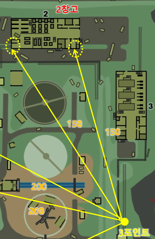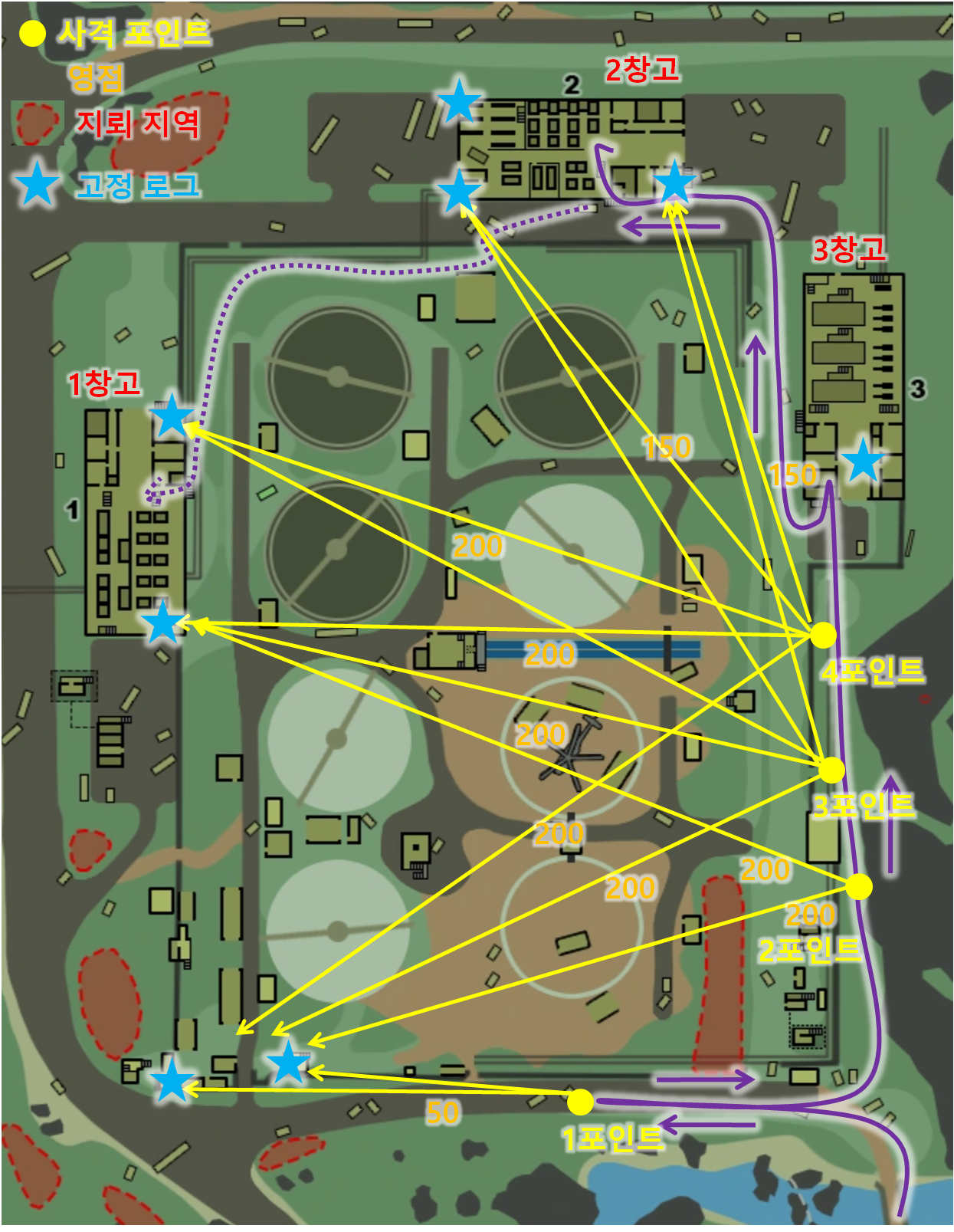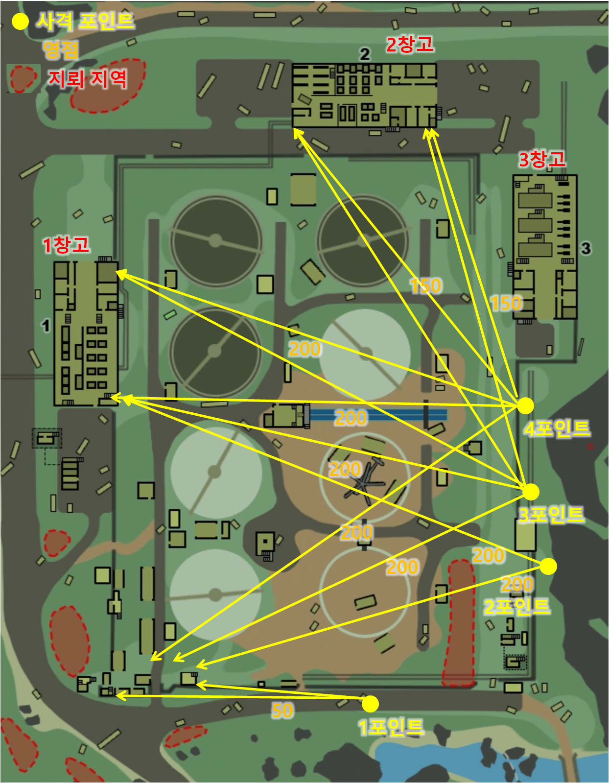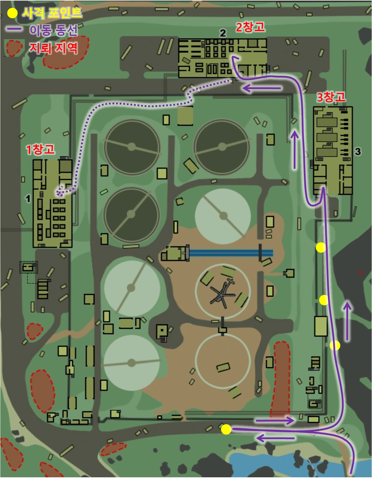 동선은 3창고 쪽 옆길을 따라갈 것입니다. 각 사격 포인트에서 멈춰서 사격을 할 건데요. 아래 지도를 보시면서 설명드리겠습니다.