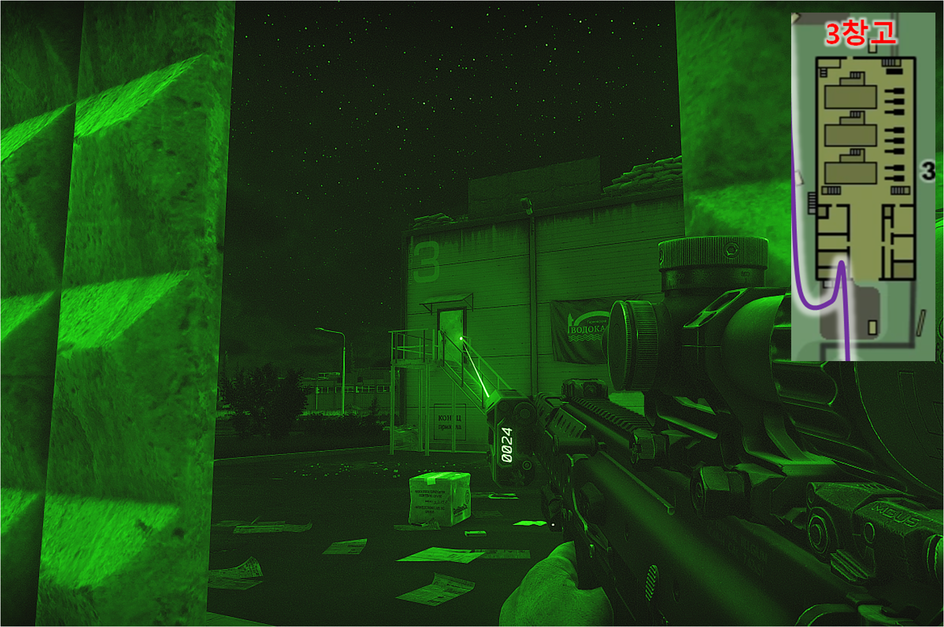 3사격 포인트는 마찬가지로 벽을 끼고 가다 보면 보이는 네모 구멍 뚫린 벽입니다. 여기서는 입구 초소부터 1창고 2창고까지 모두 저격하겠습니다.