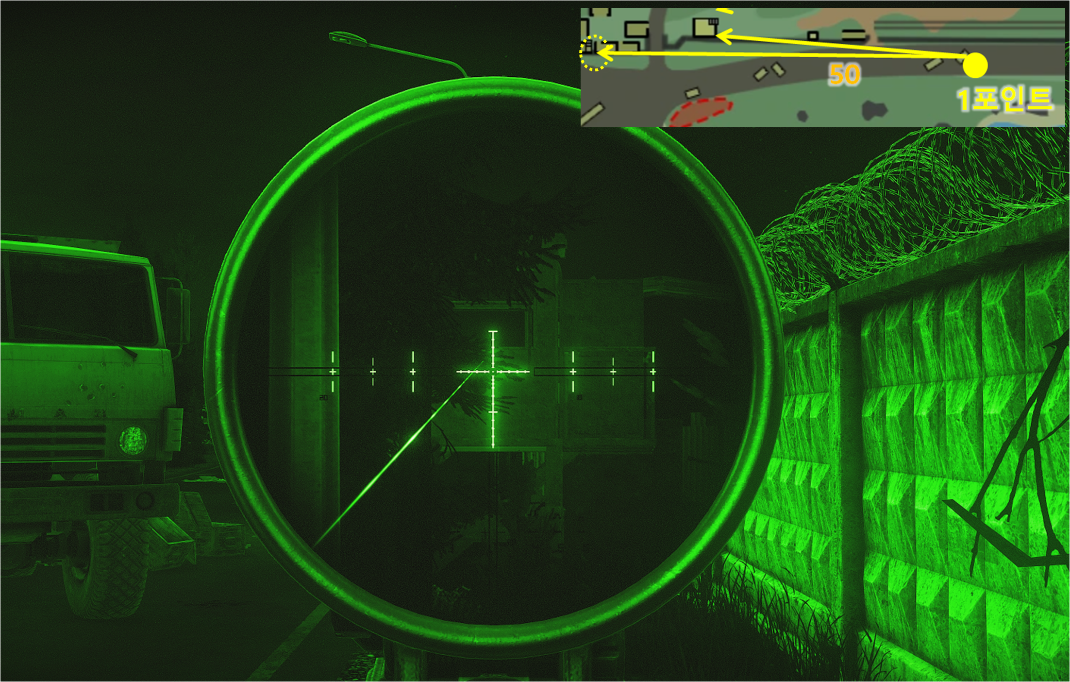 초소 및 기관총 자리는 영점을 50 잡고 머리를 톡 쏴주면 됩니다.