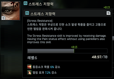 [스트레스 저항력]은 체력이 낮은 상태를 오래 유지하거나 고통(Pain) 상태이상을 얻을 때마다 조금씩 오릅니다.
