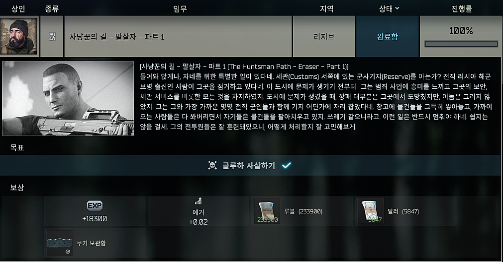 타르코프 퀘스트 - 사냥꾼의 길 - 말살자 - 파트 1 (The Huntsman Path - Eraser - Part 1)