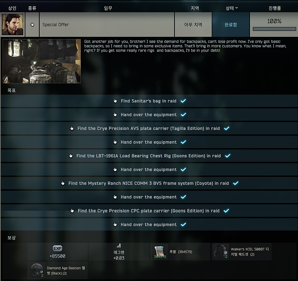 레이드에서 보스 장비들을 구해야 합니다. 죽어서 인레이드 마크(Found in raid mark)가 없어지면 퀘스트로 제출하지 못하기 때문에 구하면 꼭 무사히 탈출하는 것을 목표로 하셔야 합니다.