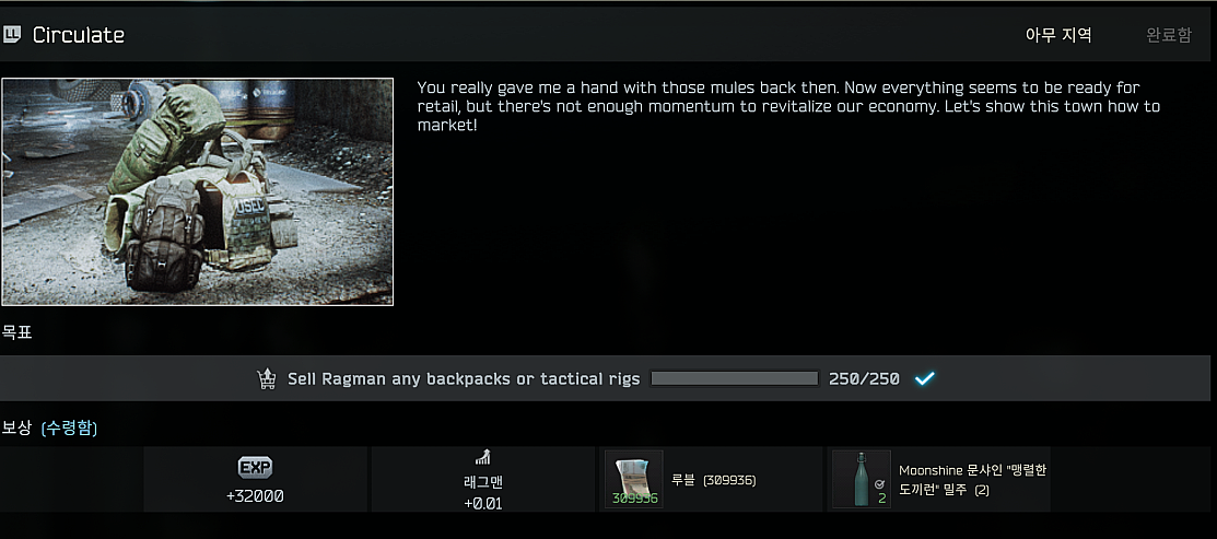 백팩(backpacks)이나 전술 조기(Tactical rigs)를 250개 판매하면 됩니다. 인레이드(Found in raid)는 필요 없습니다.